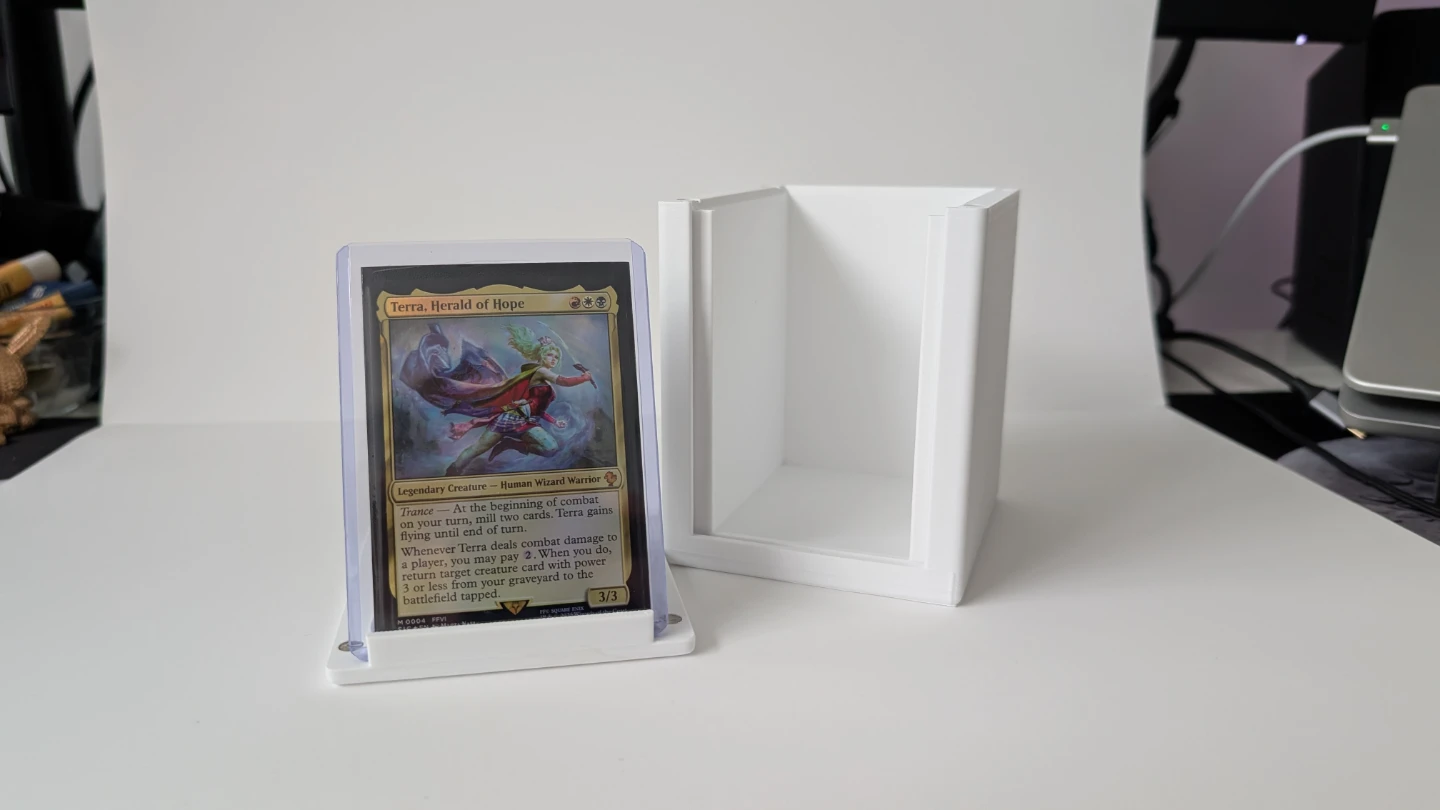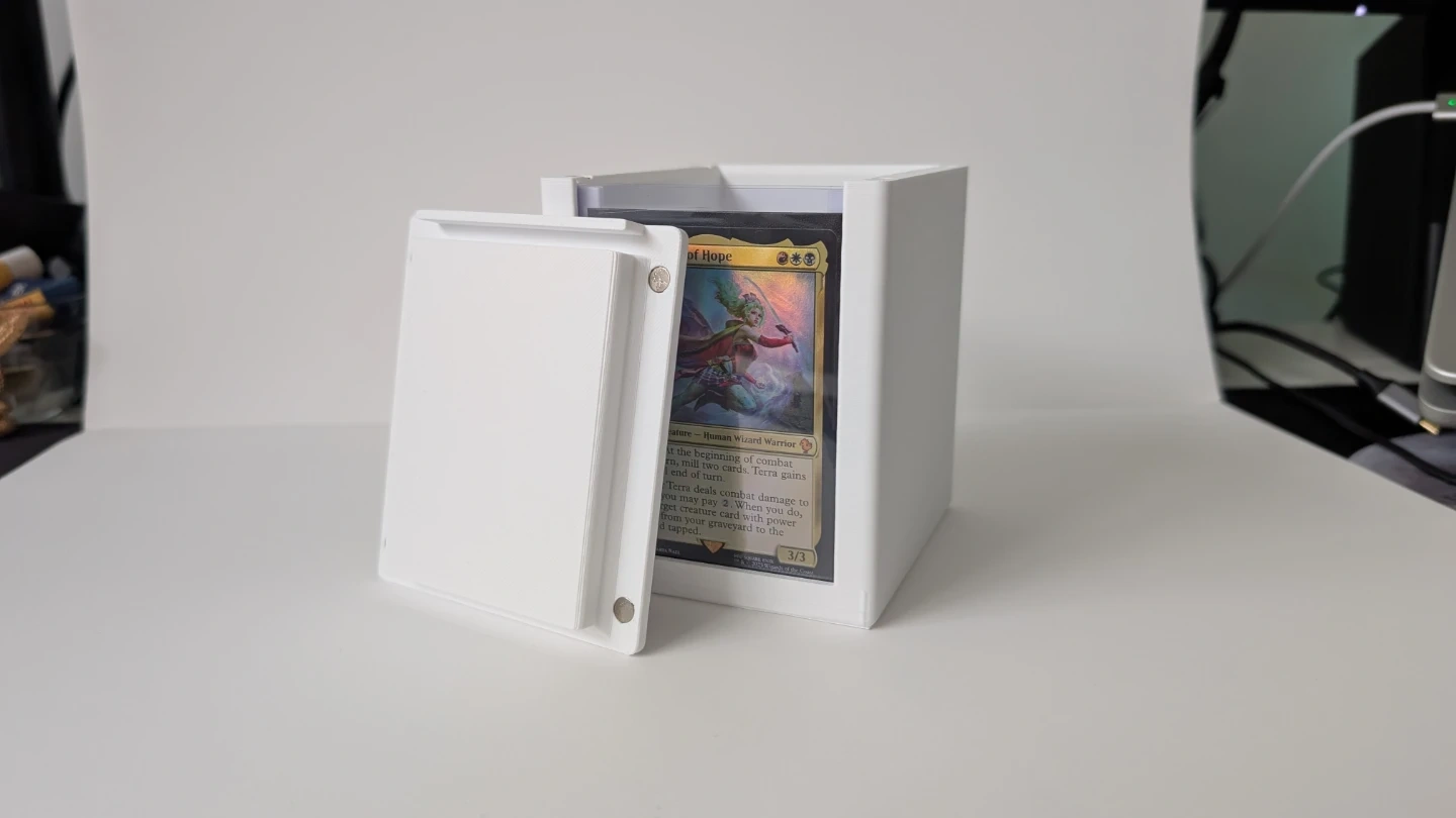 A magnetically secured top panel keeps your deck safe while allowing quick access during gameplay. The highlight feature is the display window, perfectly sized for a standard top loader, so you can proudly showcase your commander, featured card, or favorite collectible without removing it.