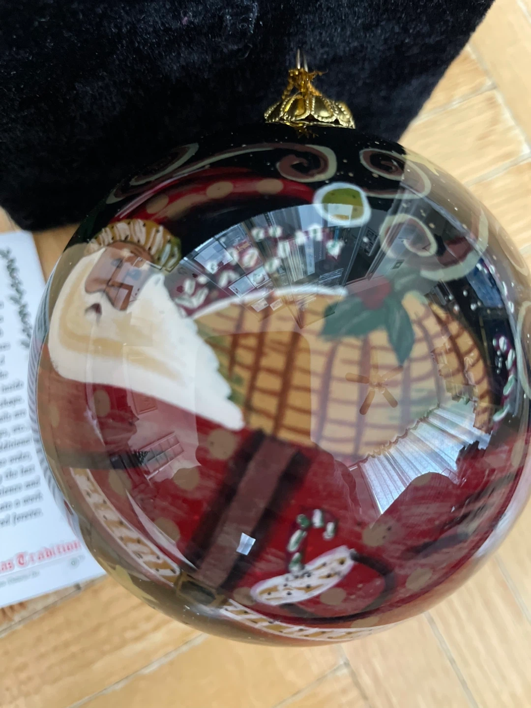 Selling a beautiful Christmas Tradition ornament. It features a Chinese reverse painting of Santa Claus. Comes in the original box. Like new.