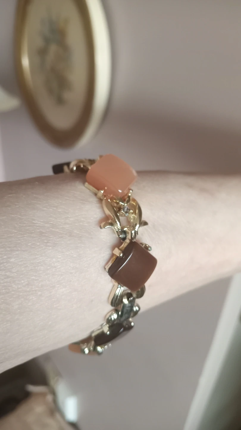 Selling a vintage-style bracelet with alternating brown and peach coloured squares. The bracelet is in good condition and would be a lovely addition to any outfit!