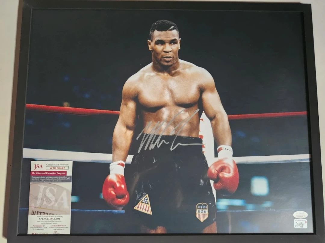 Selling an autographed 16 x 20 photo of Mike Tyson framed ready to display. This item has been authenticated by JSA, and the certification number is WB138442. A great piece for any boxing fan or collector!