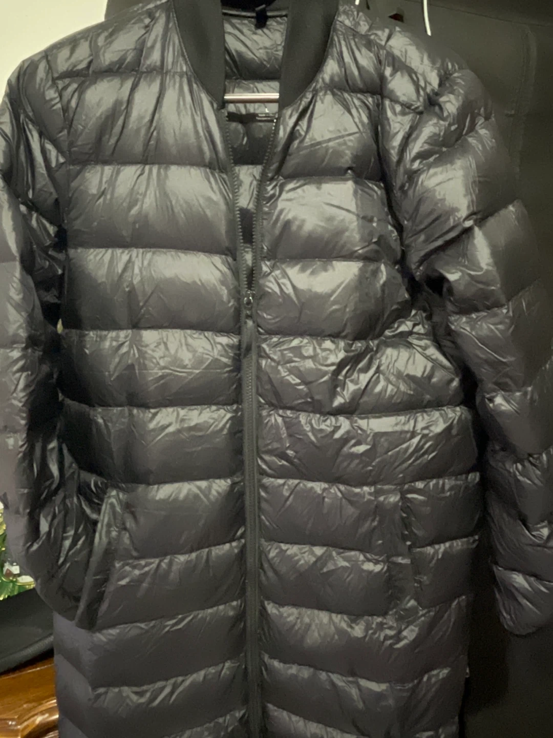 Selling a TNA Chalet Super Light Long puffer in black! It's a great lightweight puffer coat that's perfect for spring or fall. The material is soft and comfortable, and it's in great condition