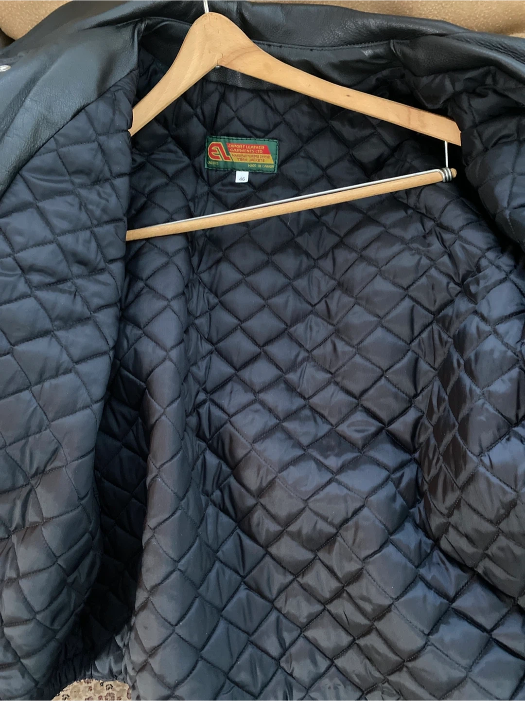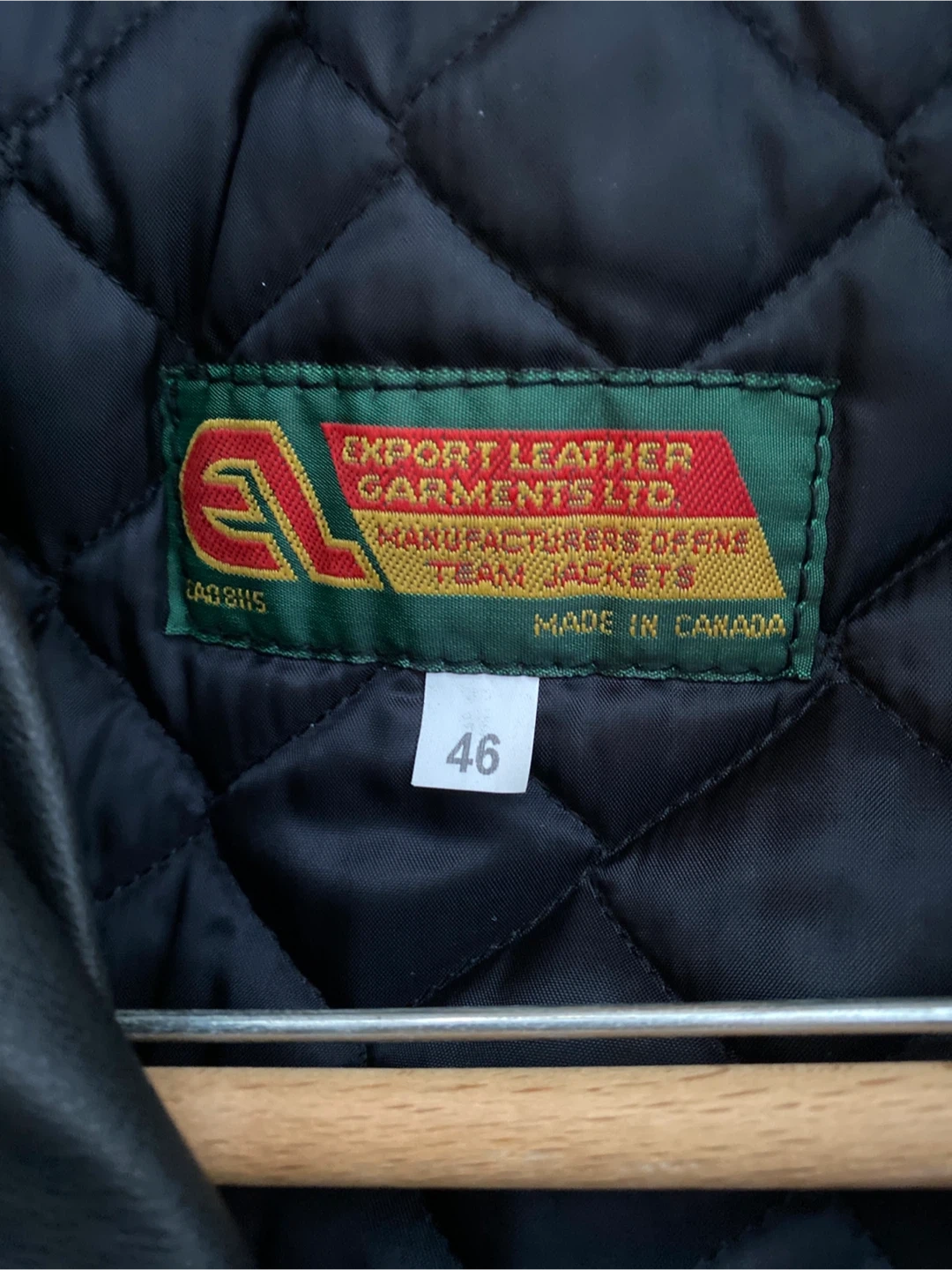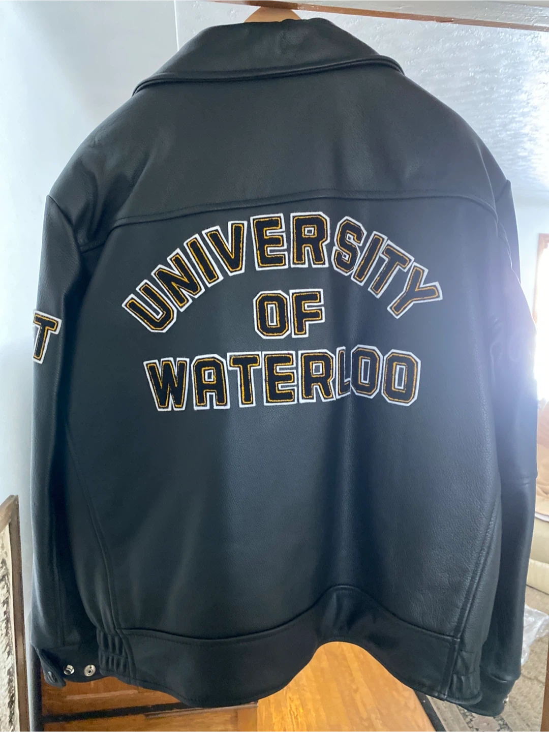 Selling a black leather jacket from Export Leather Garments, made in Canada! It's a University of Waterloo jacket, size 46. The jacket is in great condition and features the University of Waterloo logo and lettering.