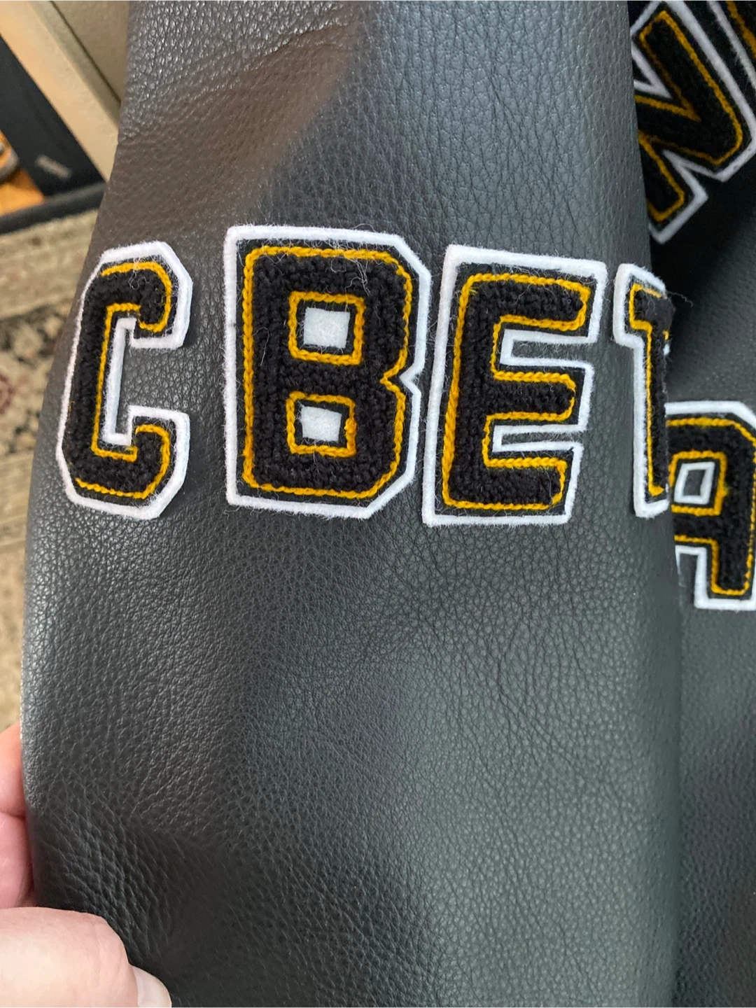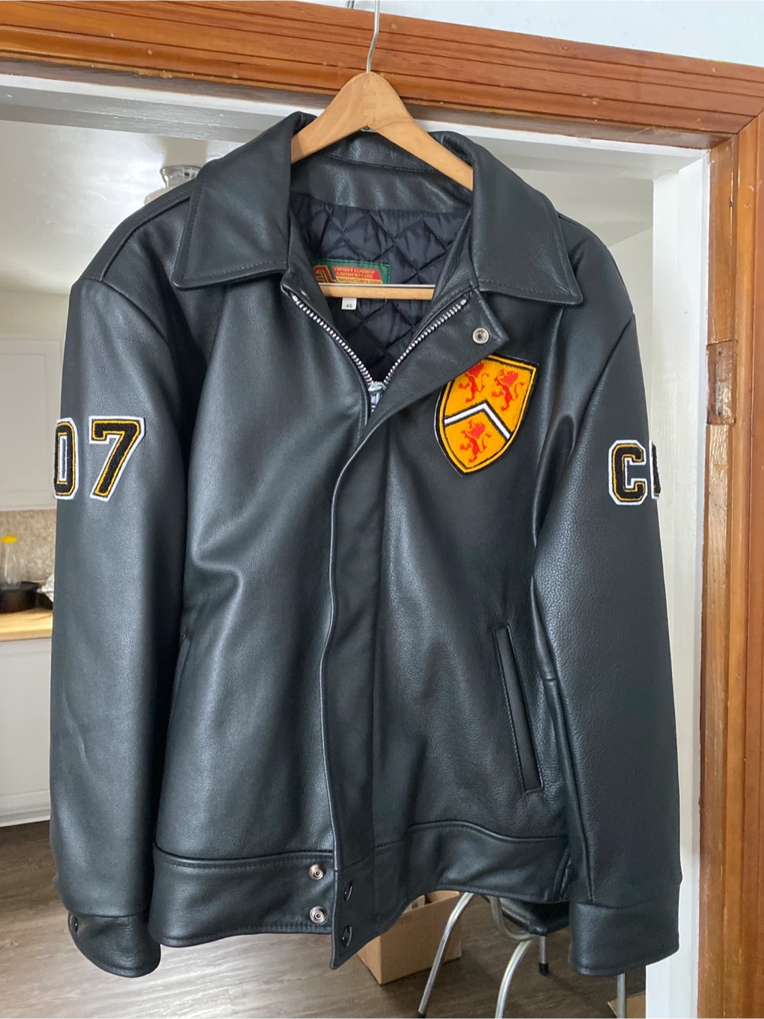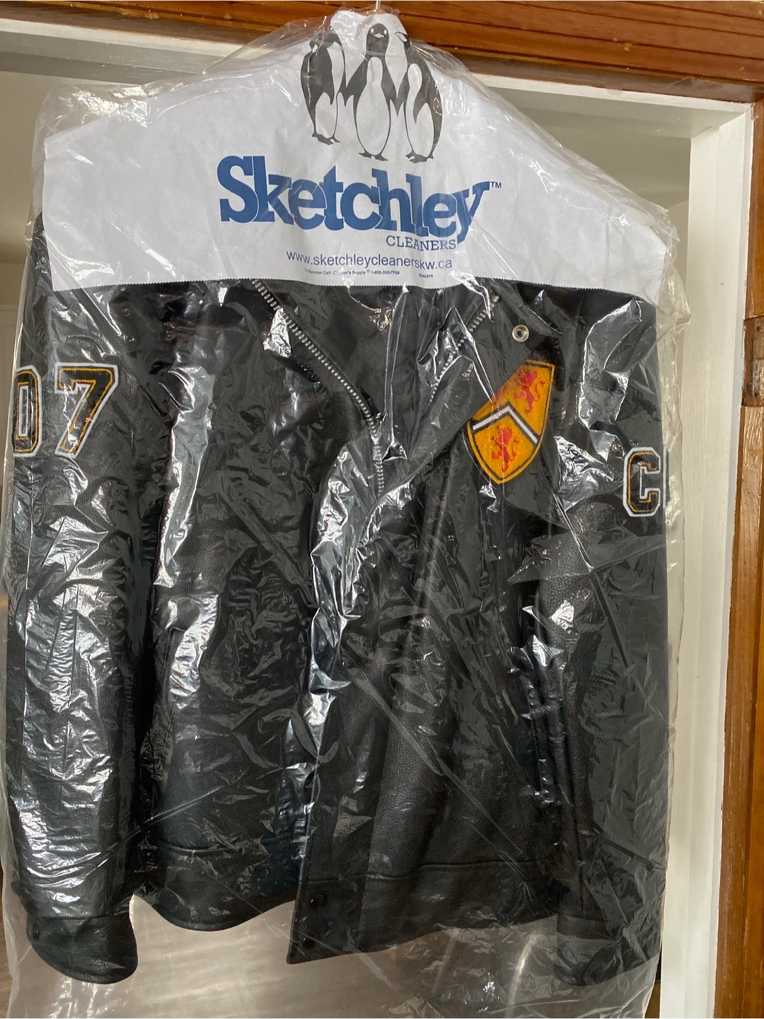 Selling a black leather jacket from Export Leather Garments, made in Canada! It's a University of Waterloo jacket, size 46. The jacket is in great condition and features the University of Waterloo logo and lettering.