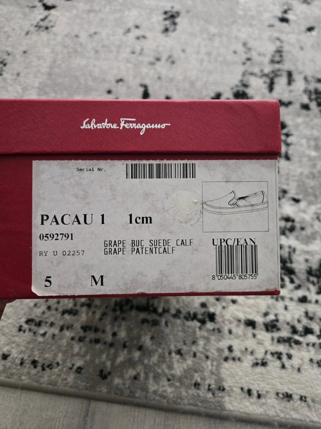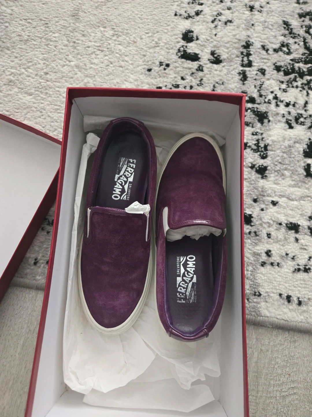 Selling a pair of Salvatore Ferragamo Pacau 1 loafers in a beautiful grape purple suede. These are a size 5M and come with the original box. They're in great condition and ready for a new owner!