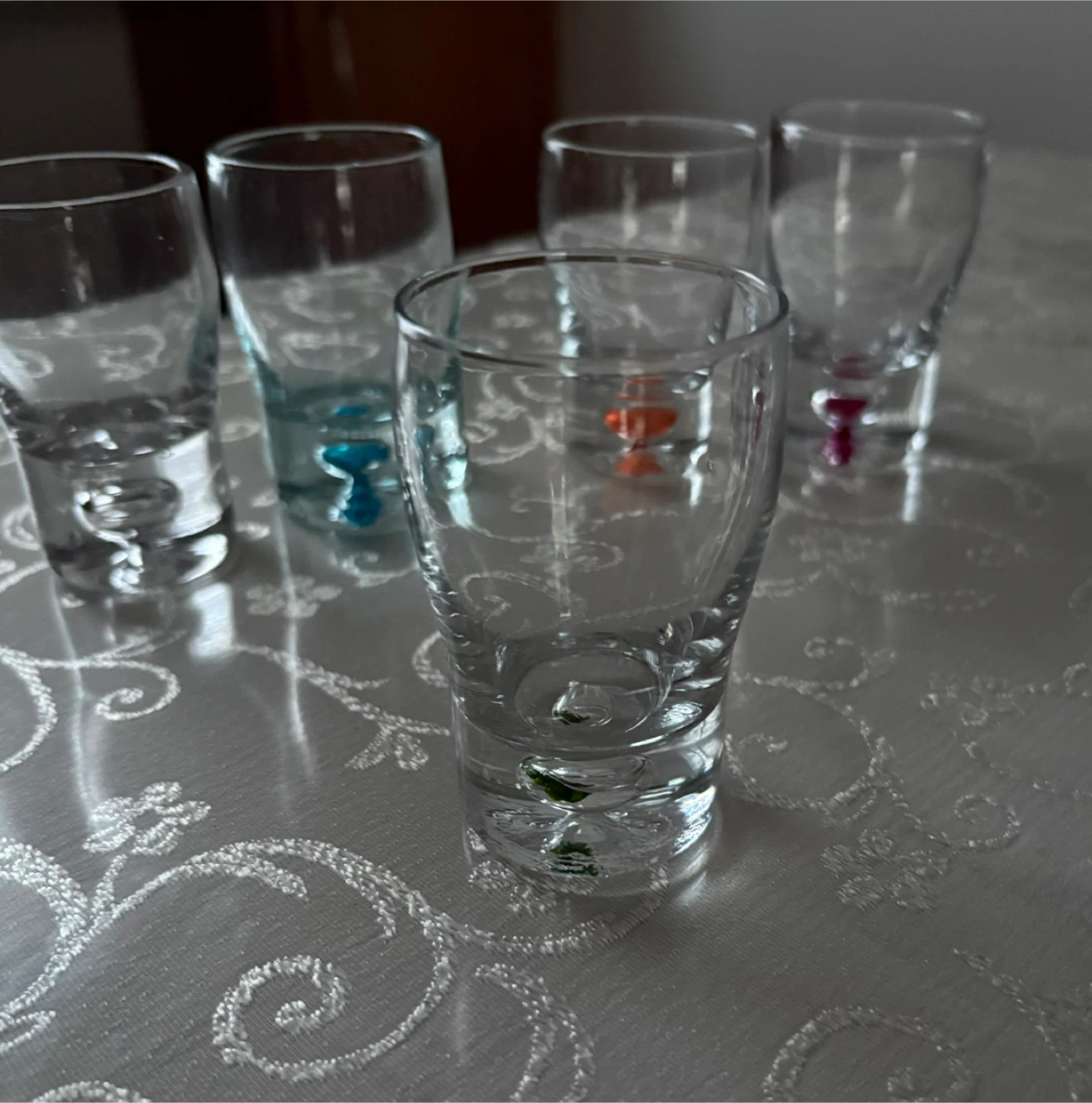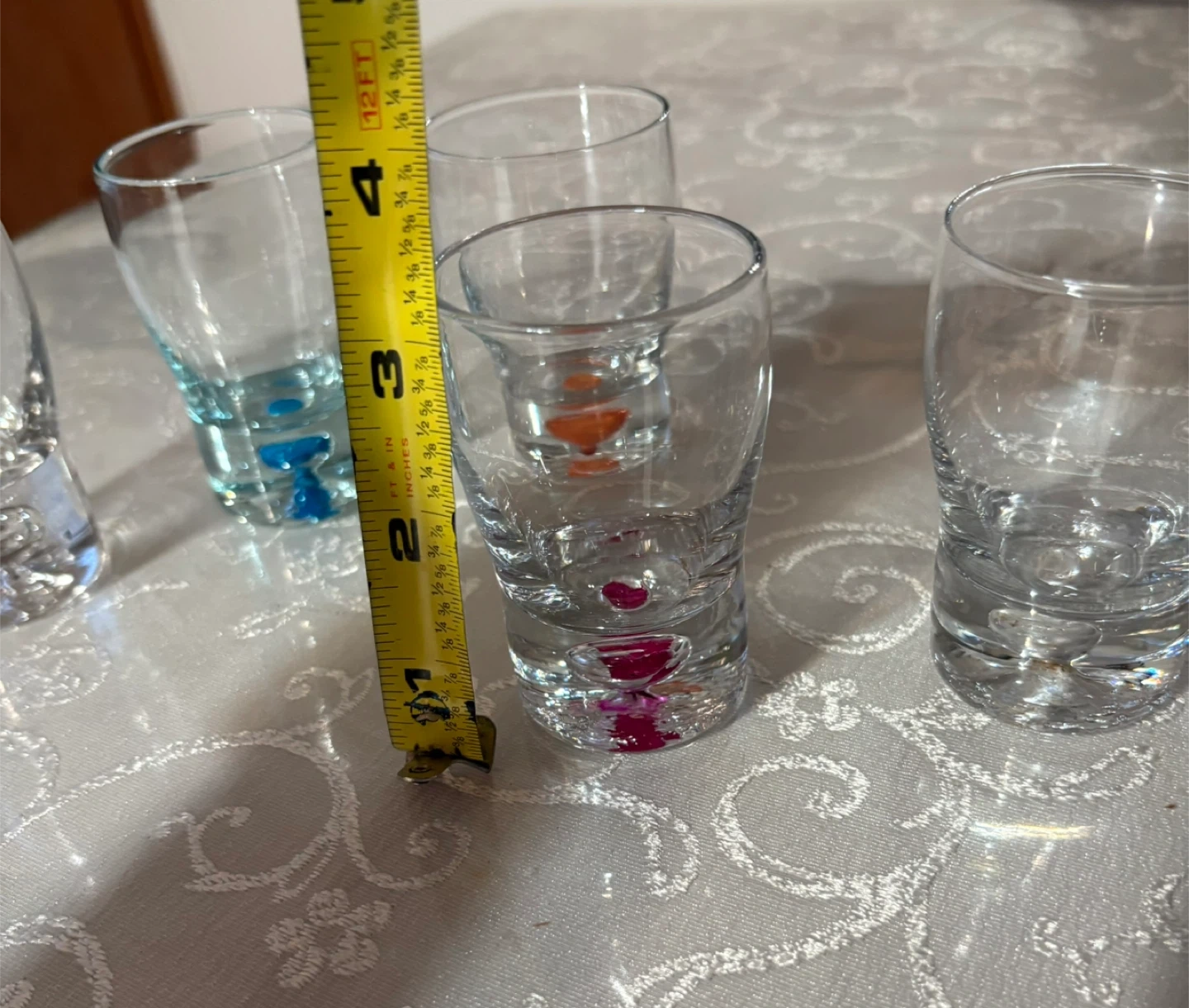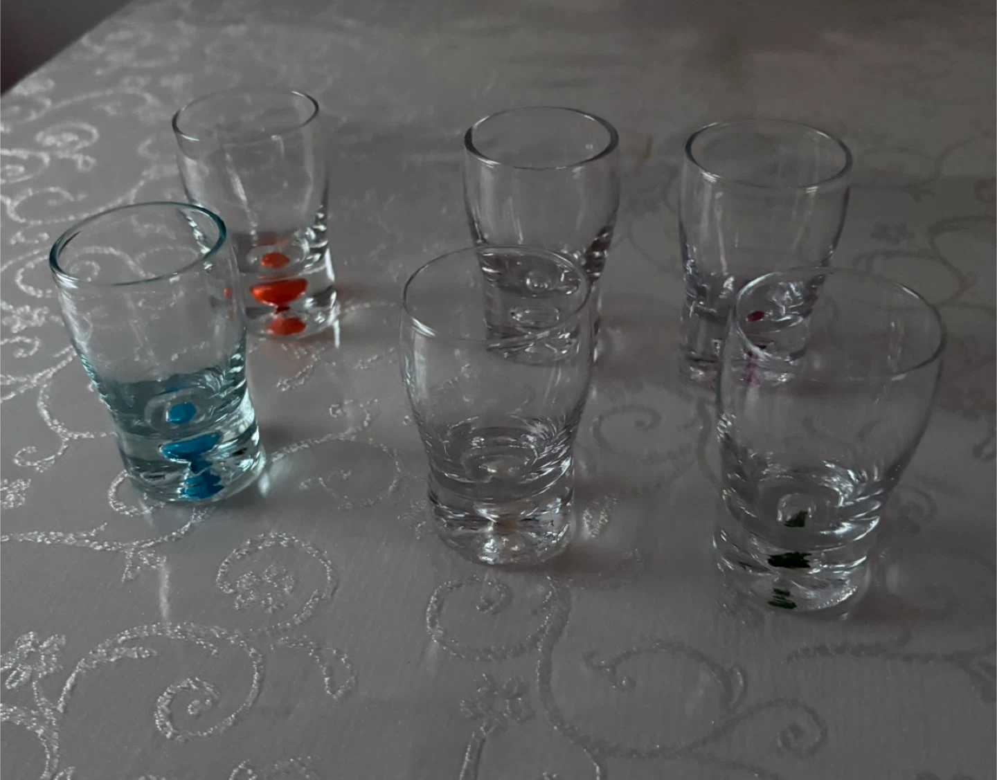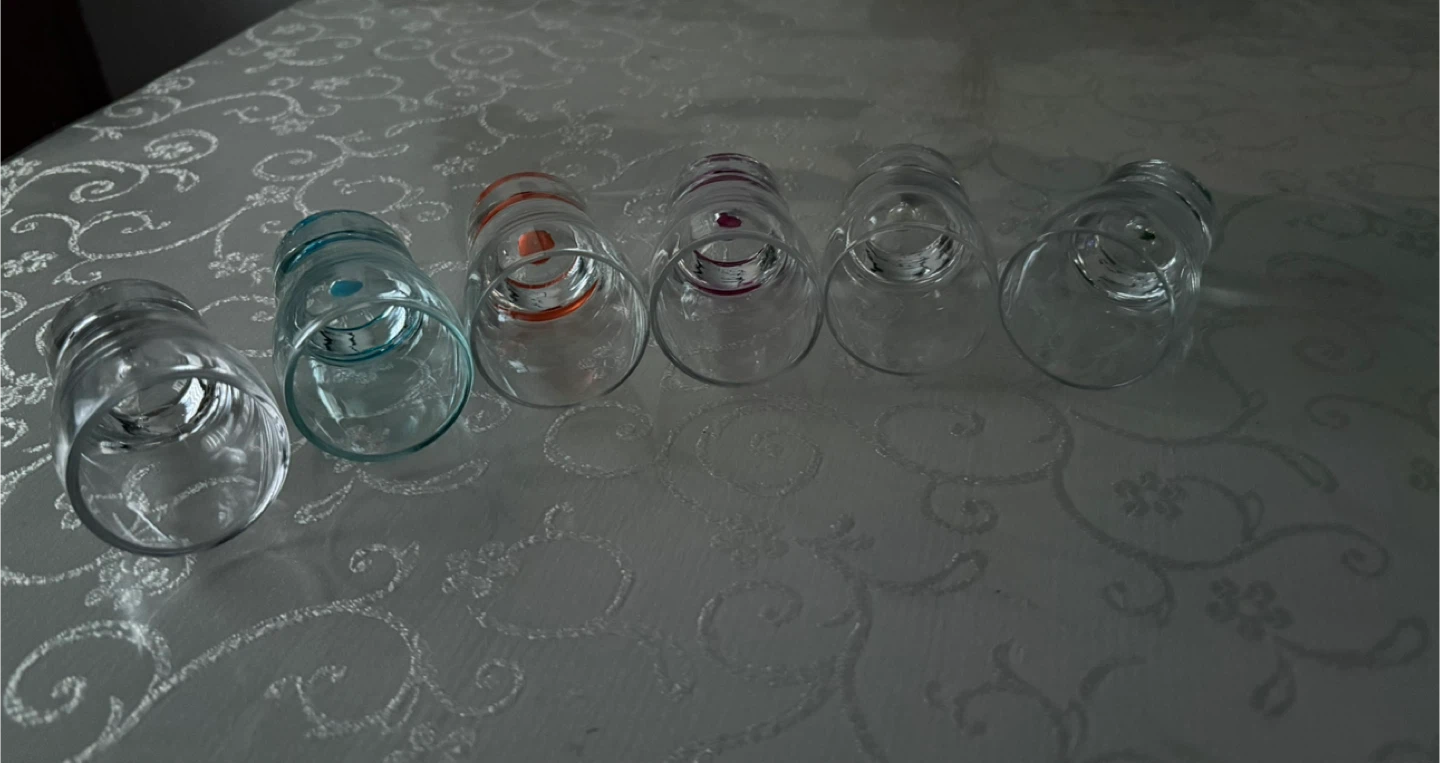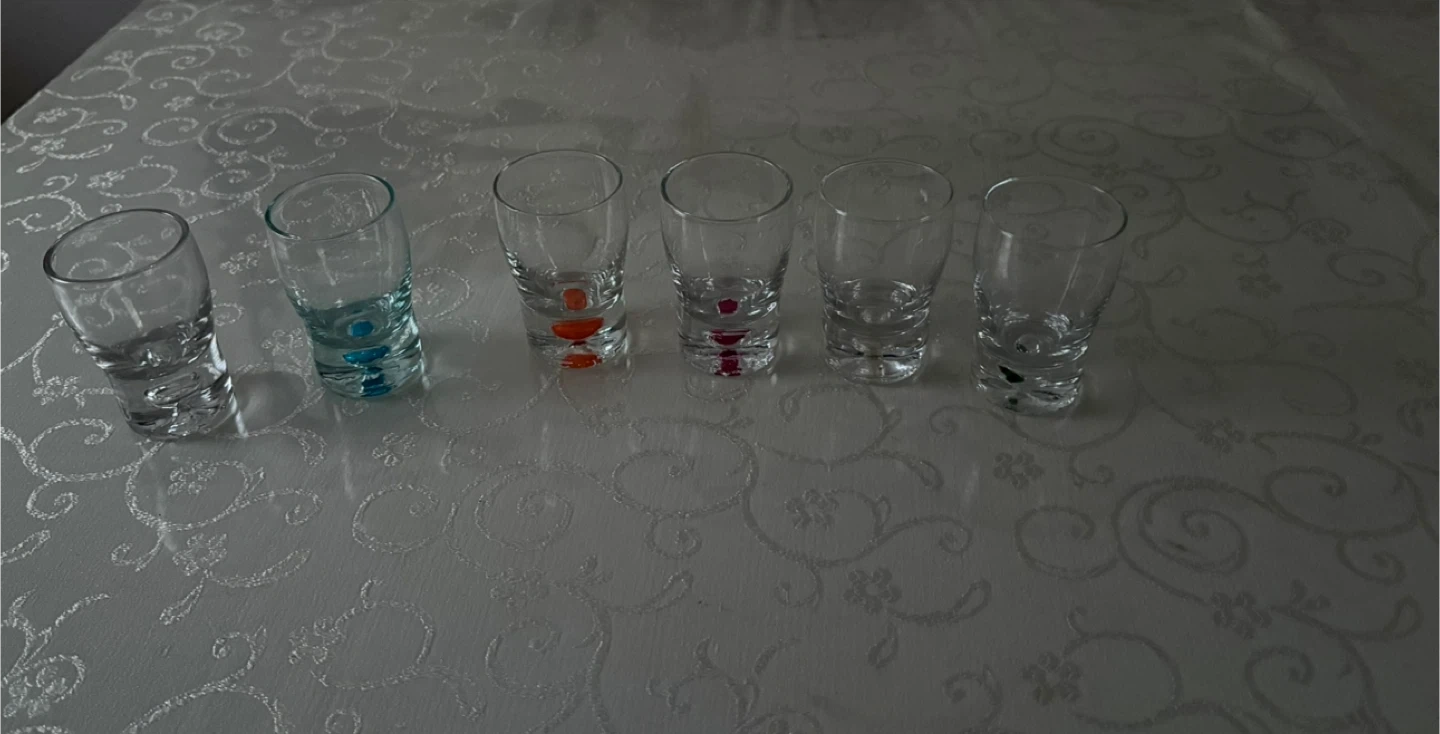 Selling a set of 6 shot glasses! They are clear glass with different color accents on the bottom. Each glass is approximately 3 inches tall and 2 inches in diameter.