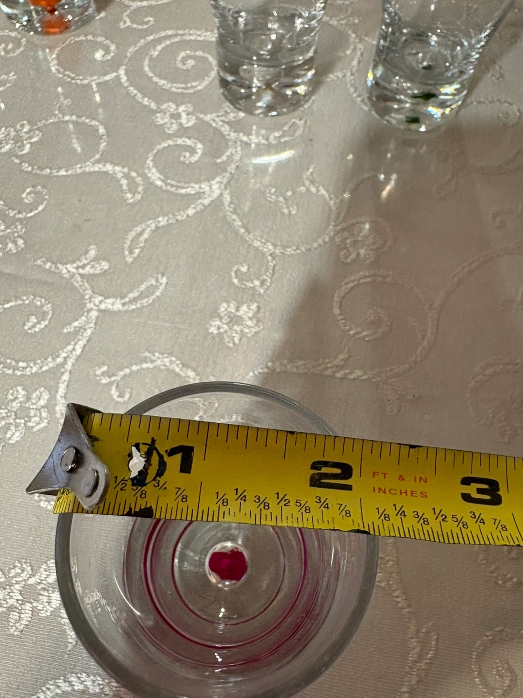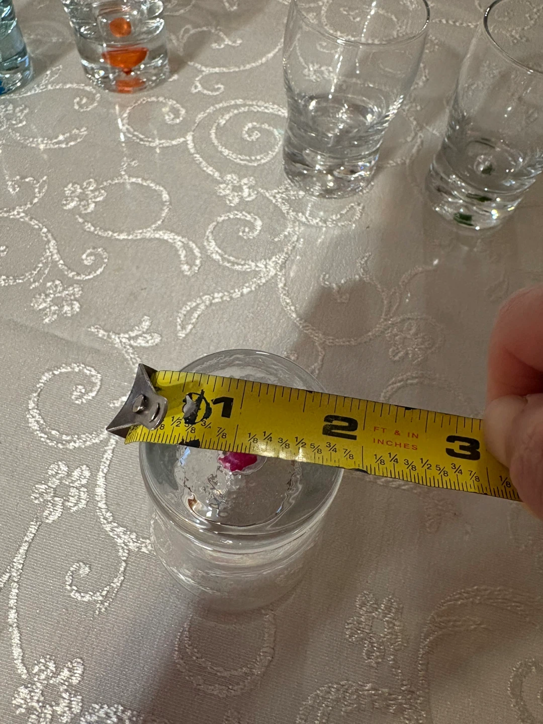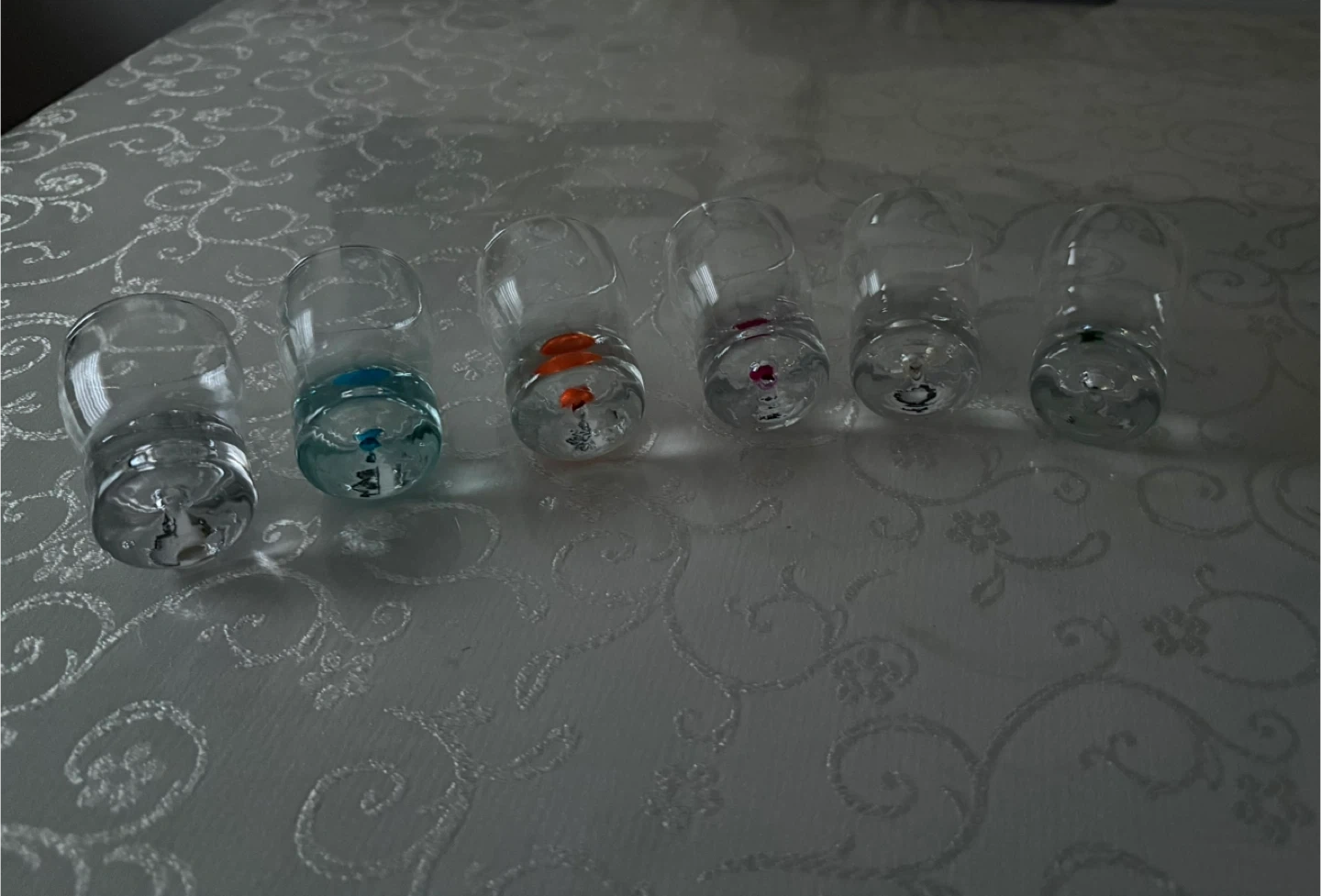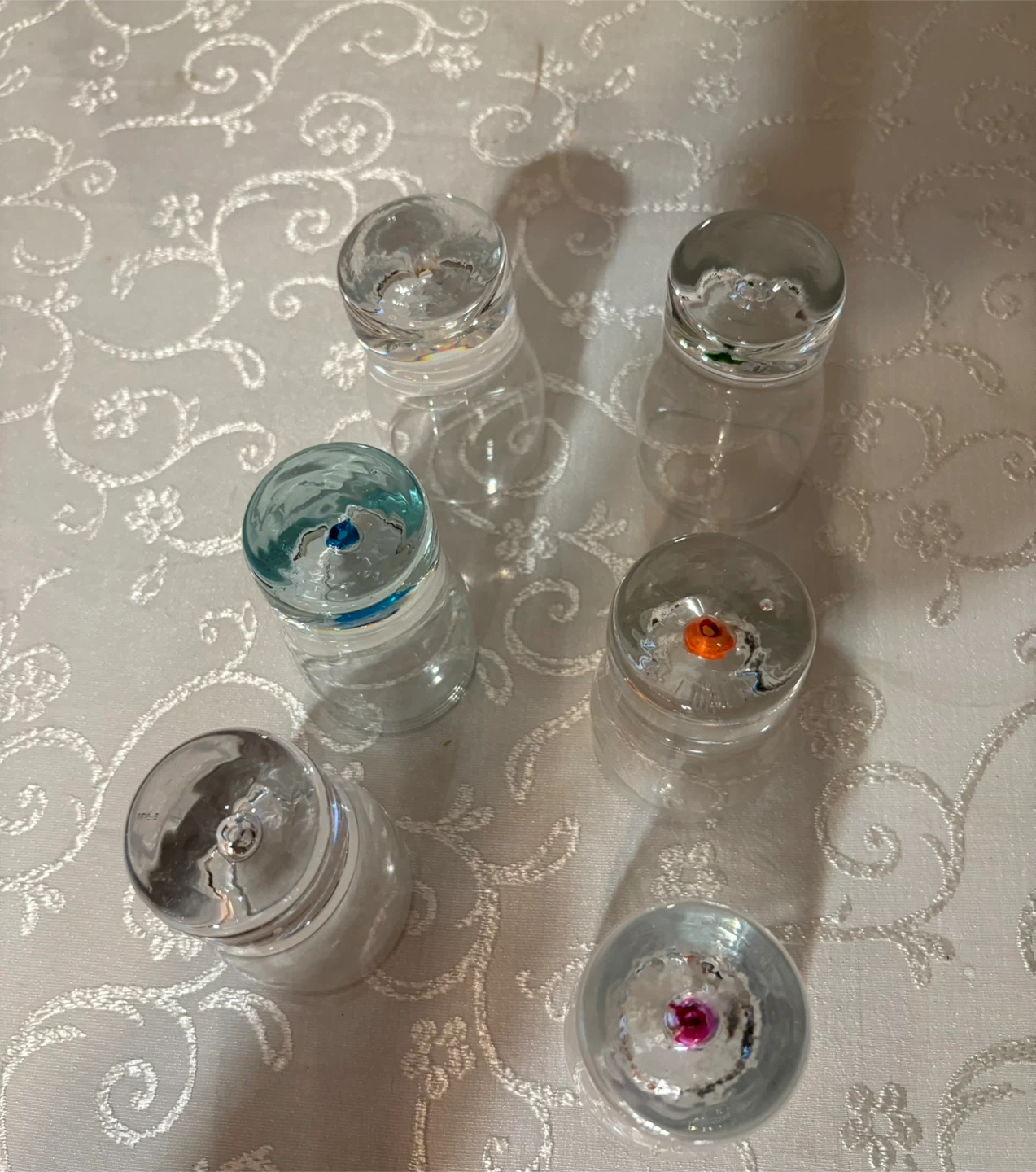 Selling a set of 6 shot glasses! They are clear glass with different color accents on the bottom. Each glass is approximately 3 inches tall and 2 inches in diameter.