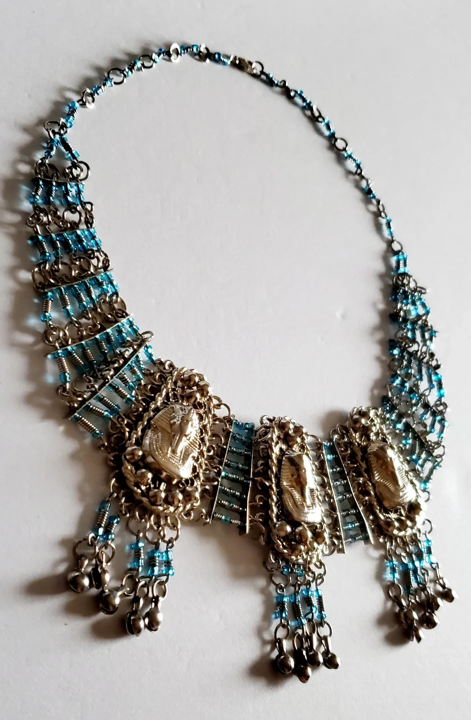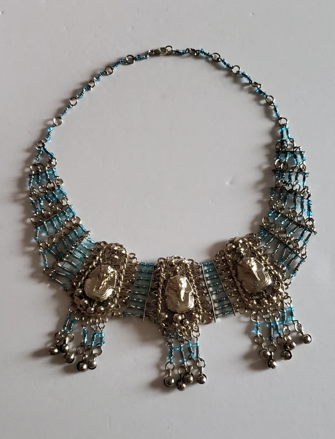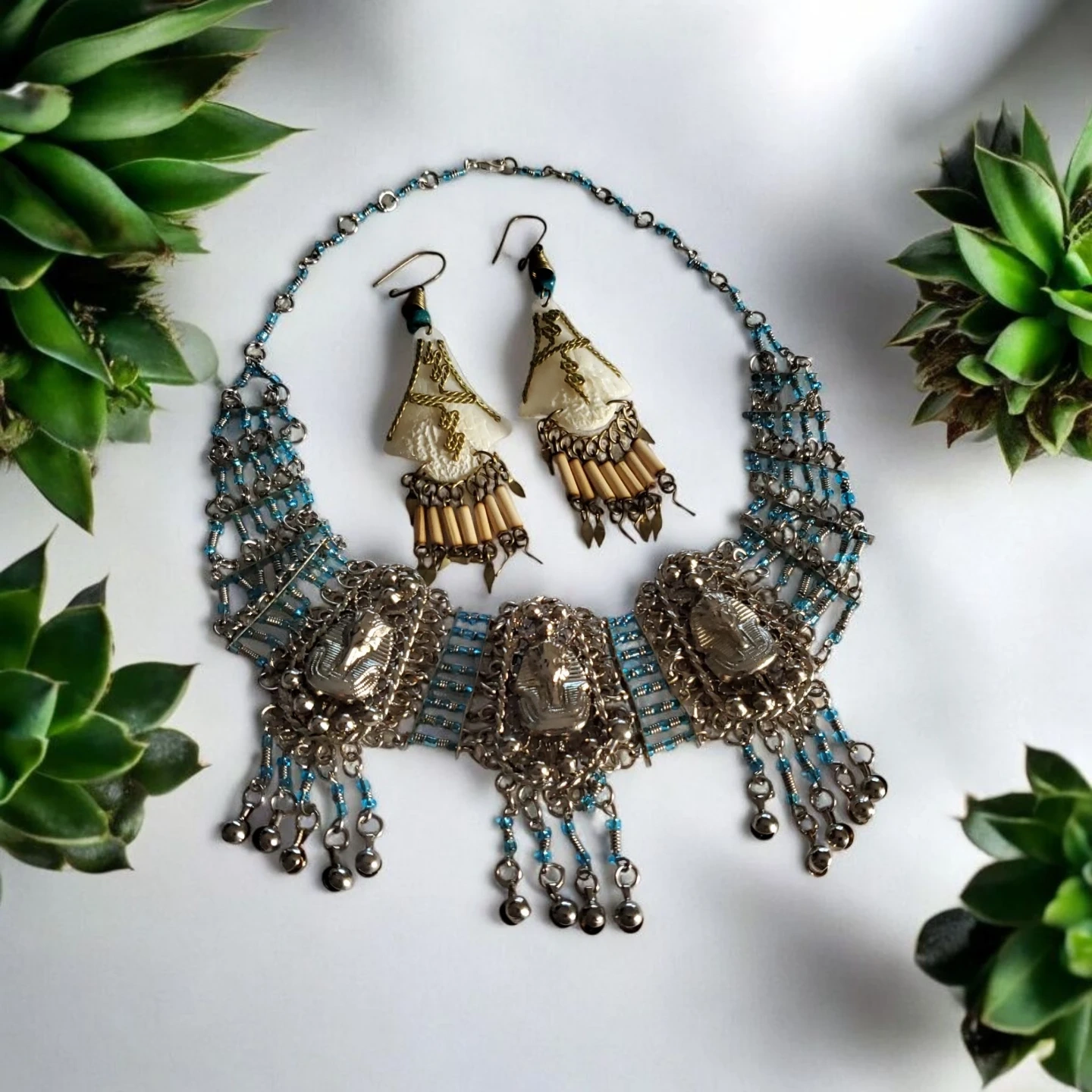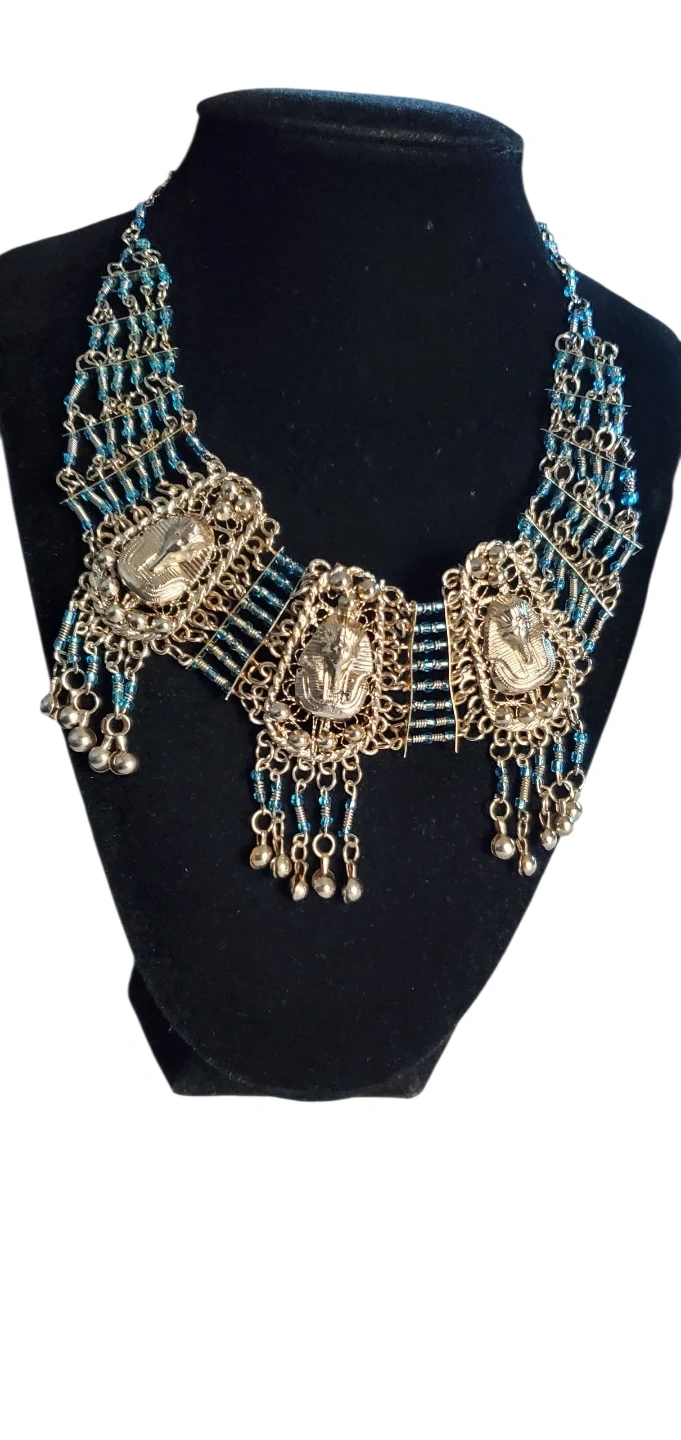 Unique necklace and earring set with an Egyptian-inspired design. The necklace features scarab beetle pendants and blue beaded accents. The earrings complement the necklace with a matching style. Perfect for adding a touch of ancient flair to your look!