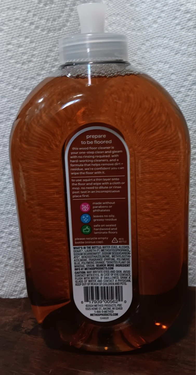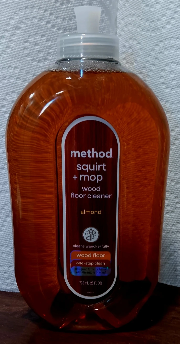 I'm selling a bottle of Method Squirt + Mop wood floor cleaner. It's designed for one-step cleaning and leaves no oily, greasy residue. The bottle contains 739 ml (25 fl oz) of almond-scented cleaner.