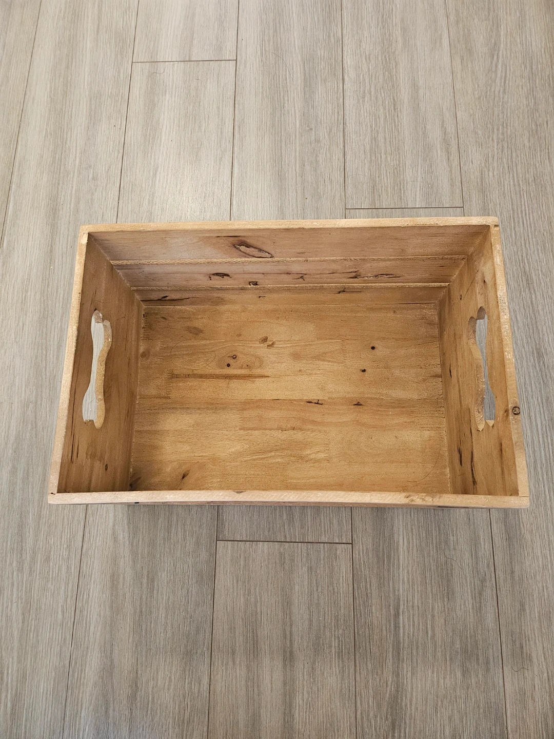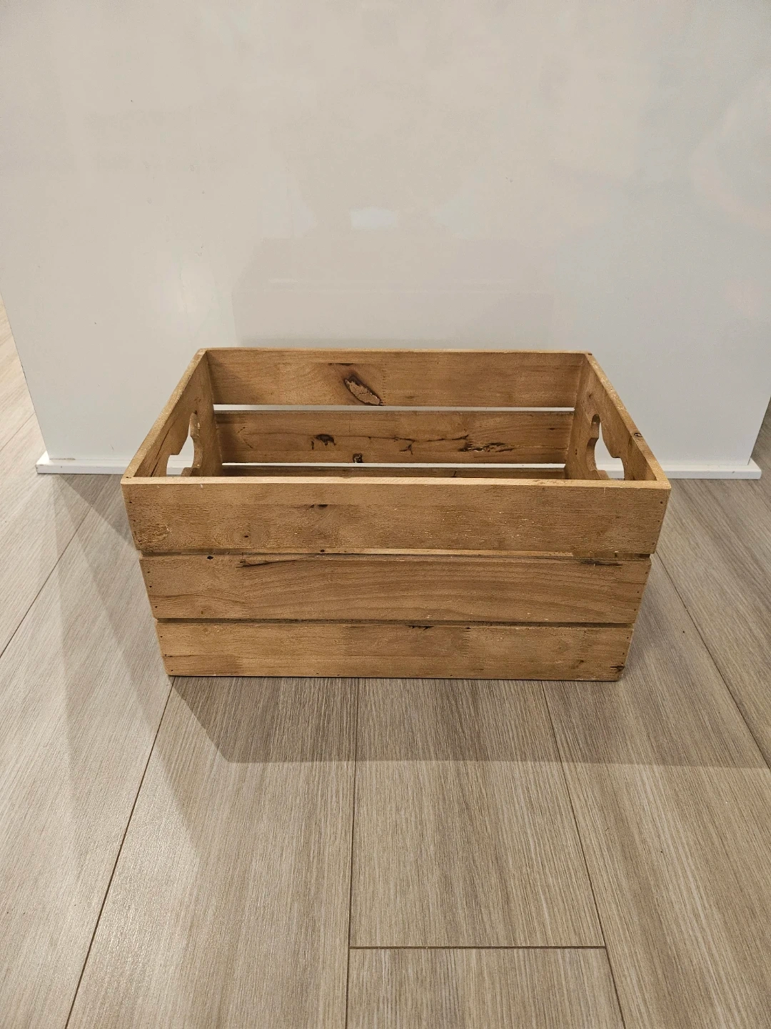 Selling a wooden storage crate in good condition. It's perfect for organizing items around the house. It has handles on the side for easy carrying