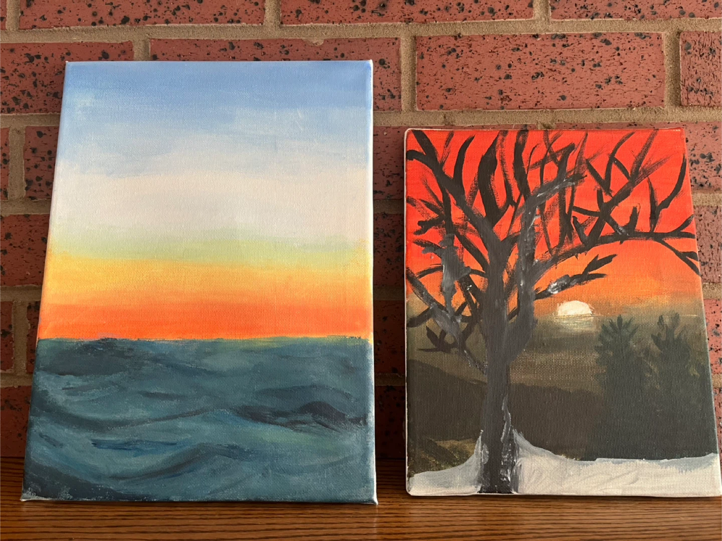 Selling two original paintings! One is a landscape of a sunset over the ocean, and the other is a tree at sunset. They would look great in any room!