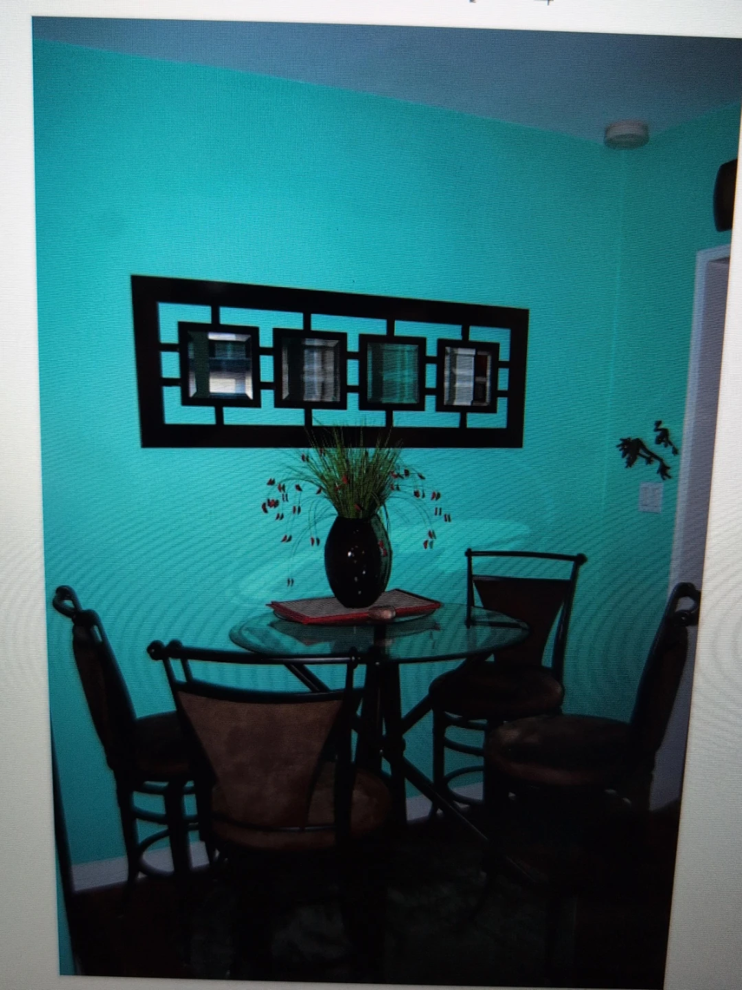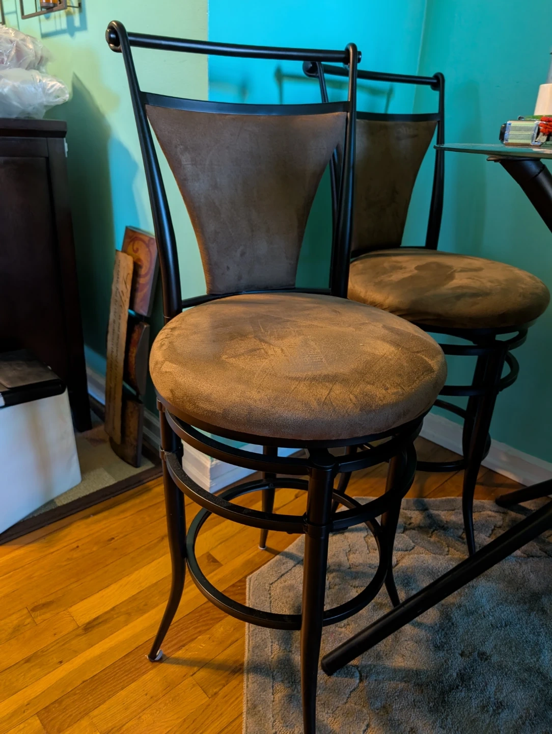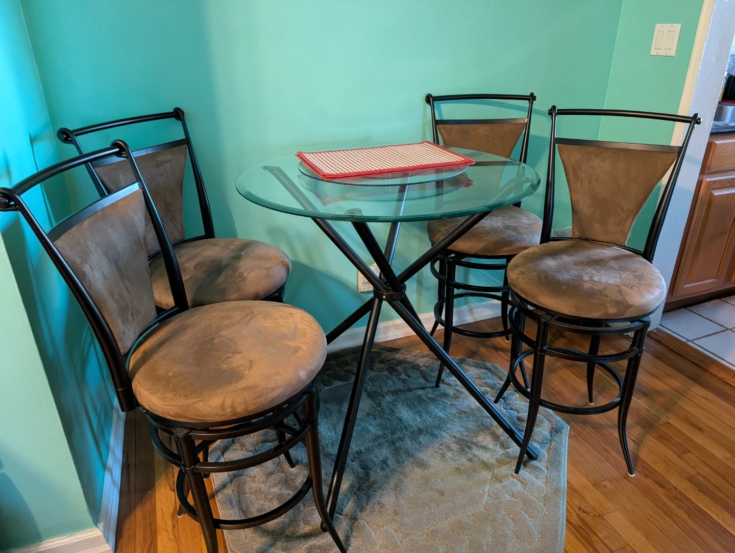 Selling a dining table with a round glass top and four stool chairs. The chairs have a unique design with a metal frame and a comfortable, upholstered seat and back. The set is in great condition and would be an amazing addition to any dining area or kitchen nook.