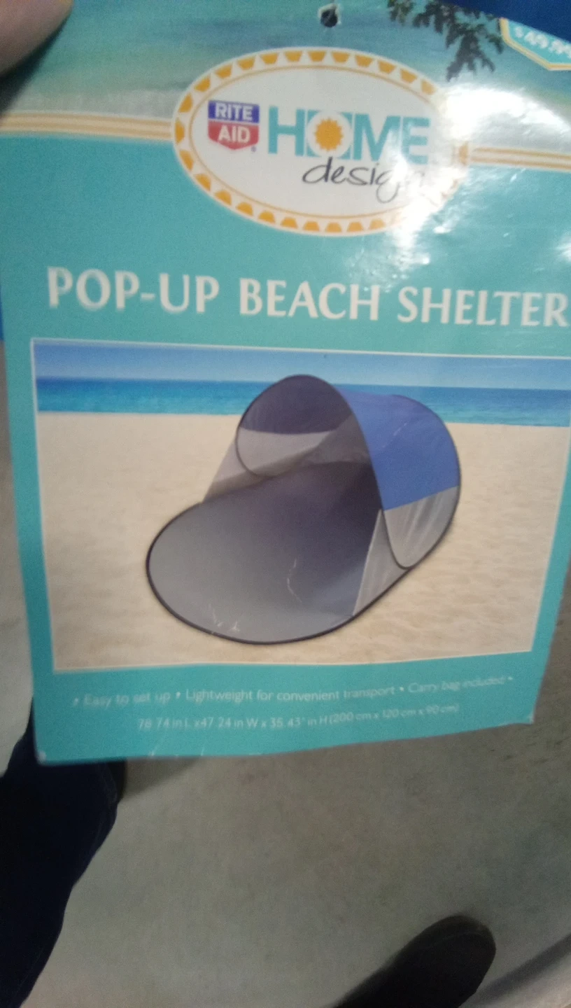 Selling a Rite Aid Home Design pop-up beach shelter. It's easy to set up and lightweight for convenient transport! The dimensions are 78.74 in L x 47.24 in W x 35.43 in H (200 cm x 120 cm x 90 cm). A carry bag is also included