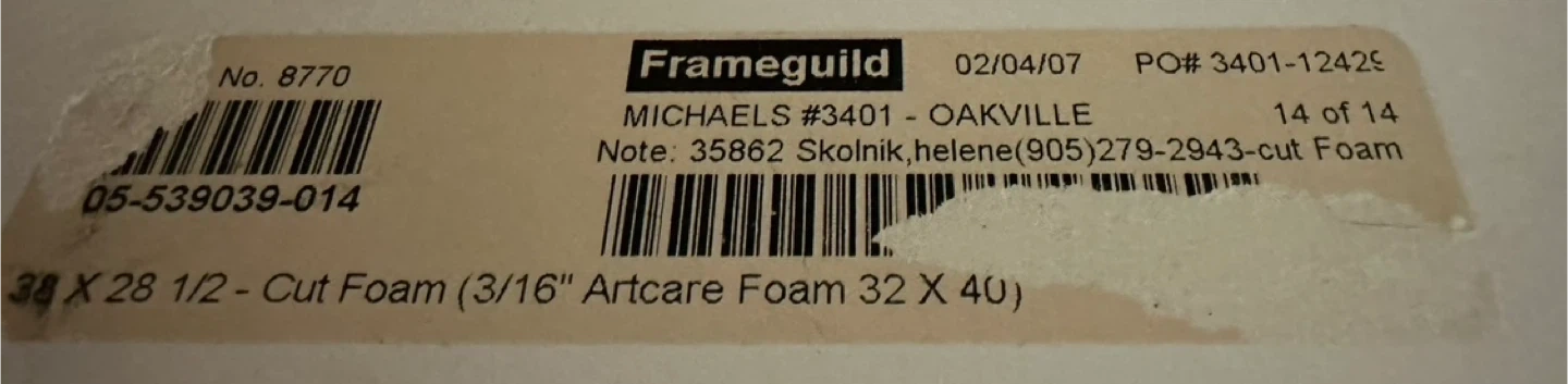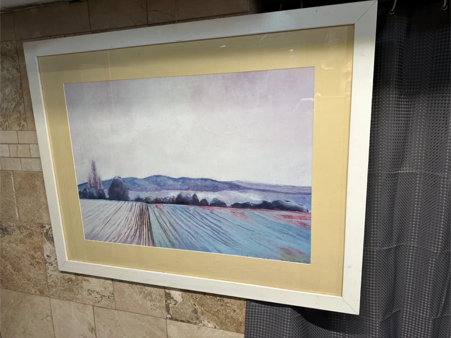 Selling a framed landscape painting. The painting features a field with trees and mountains in the background. The frame is white and the matting is a light yellow colour. It would look great in any room!