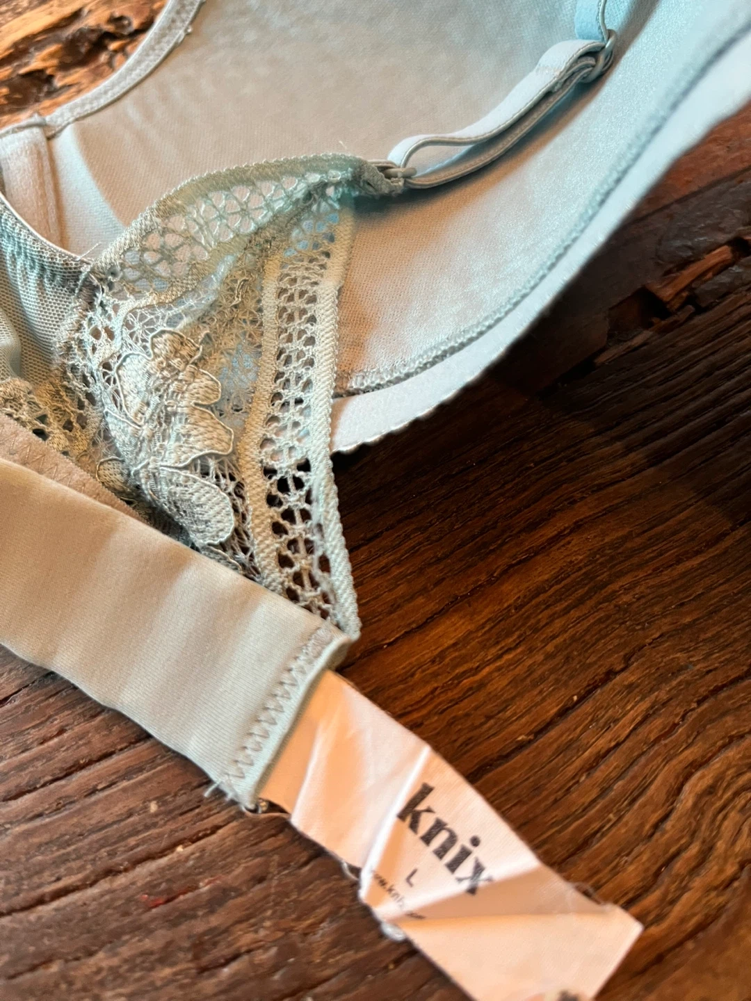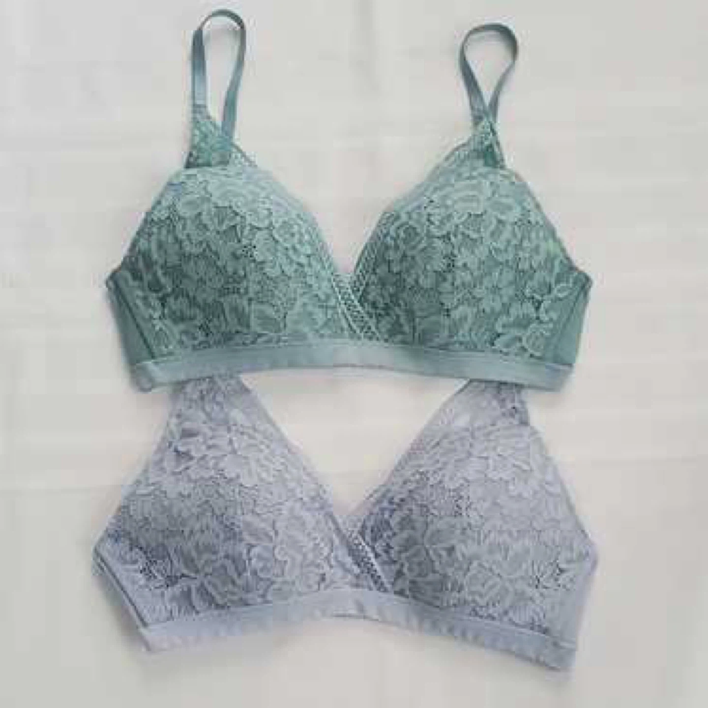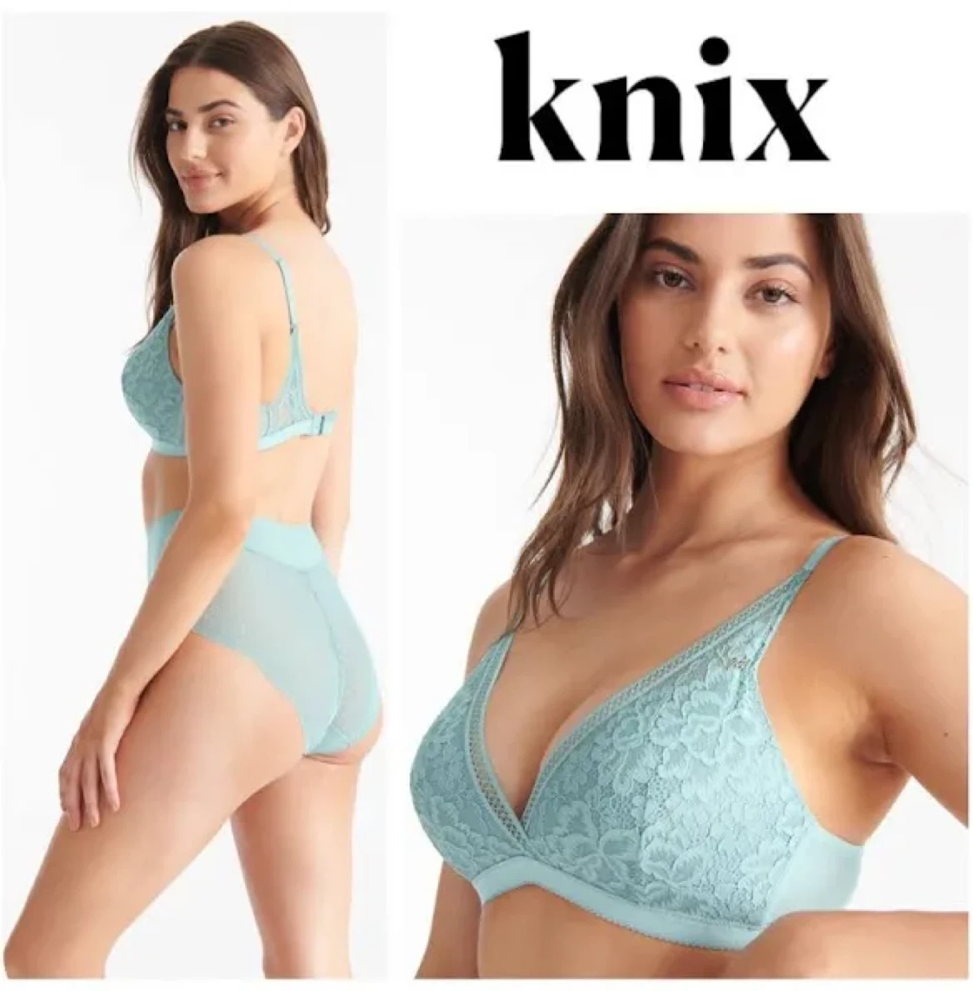 2 Knix Deep V Lace bras in sage and sky blue. These are wireless and super comfortable to wear, yet still supportive and shaping. Both Size L which should fit 36B-36C. In new condition!