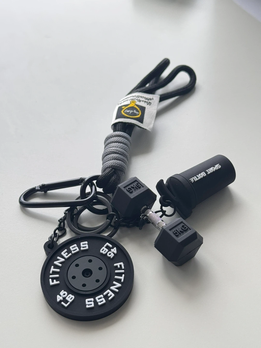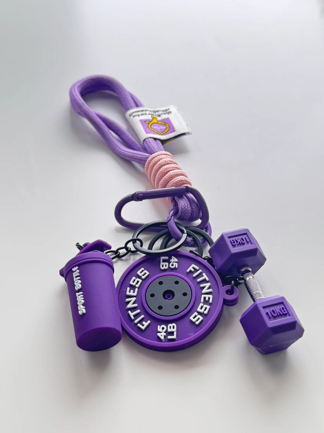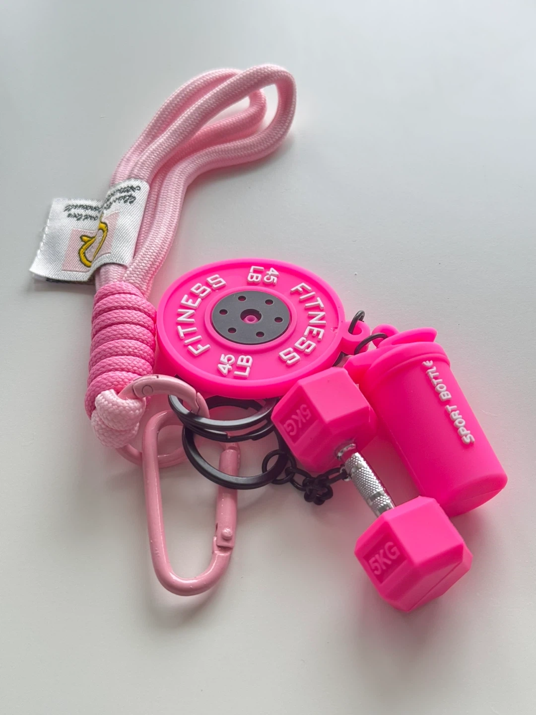 Each keychain features a mini shaker bottle, weight plate, and dumbbell charm. Perfect for fitness enthusiasts!
