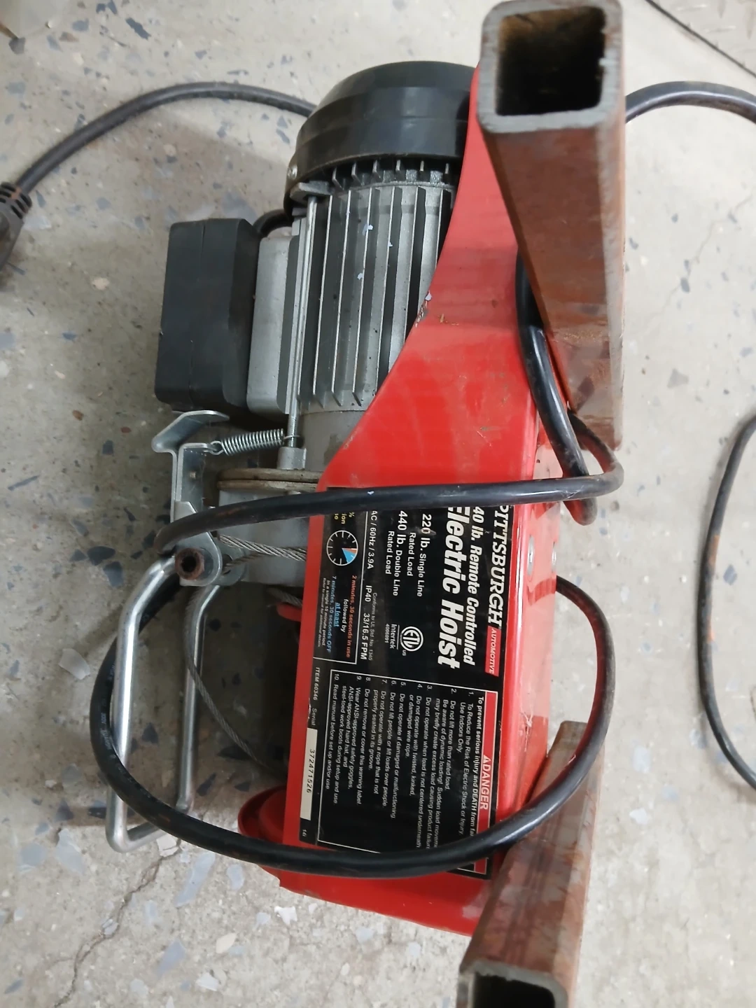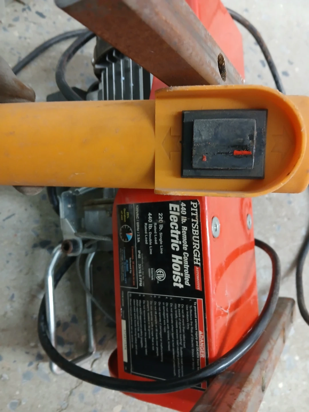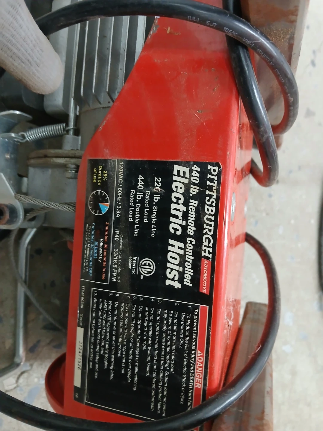 Selling a Pittsburgh Automotive 440 lb. Remote Controlled Electric Hoist. It can handle 220 lb. Single Line and 440 lb. Double Line. It runs on 120VAC/60Hz/3.9A.