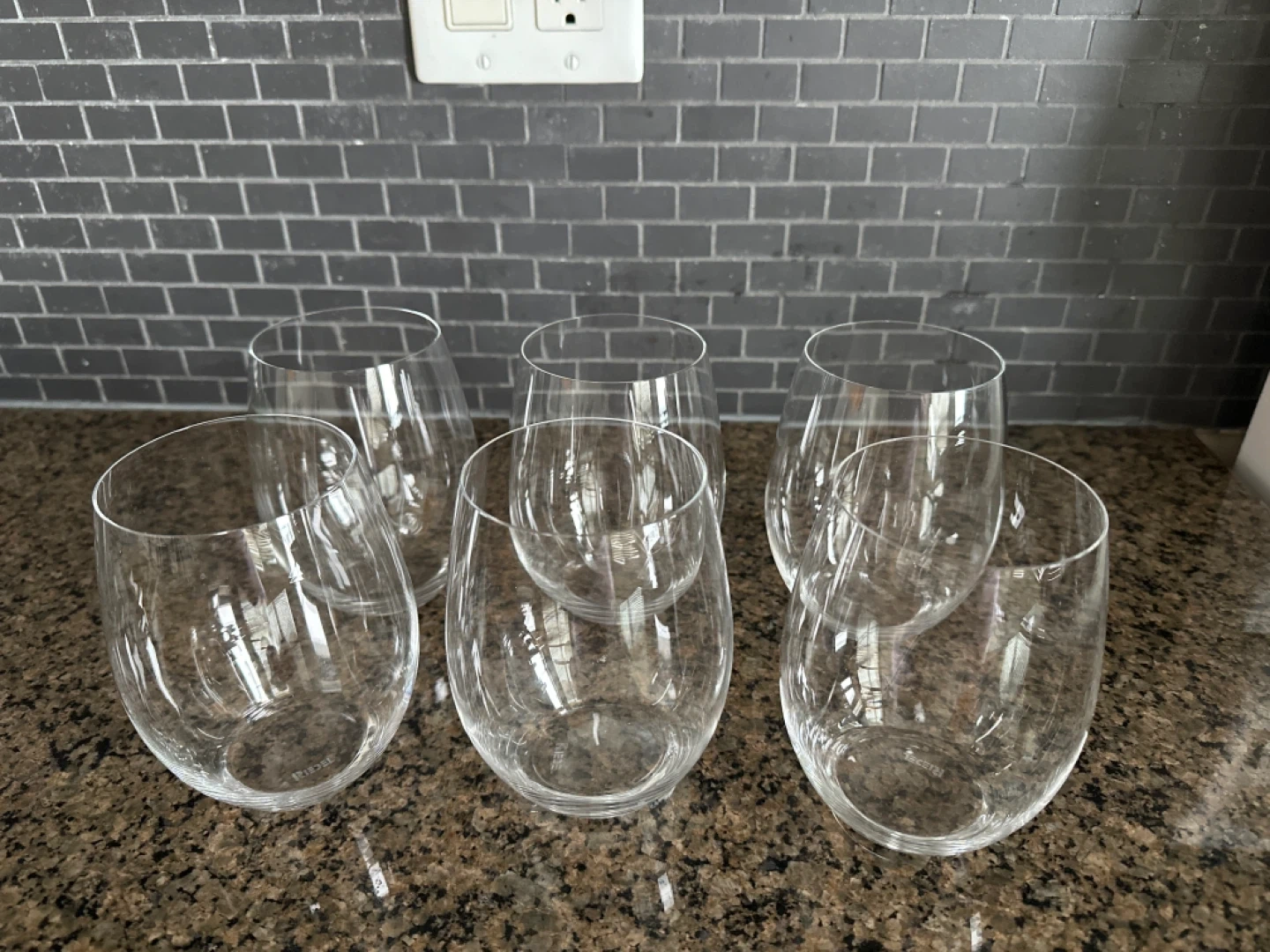 Selling a set of six Riedel 'O' stemless wine glasses! They're in good condition and ready for your next dinner party or casual get-together. These are great for everyday use and add a touch of elegance to any occasion