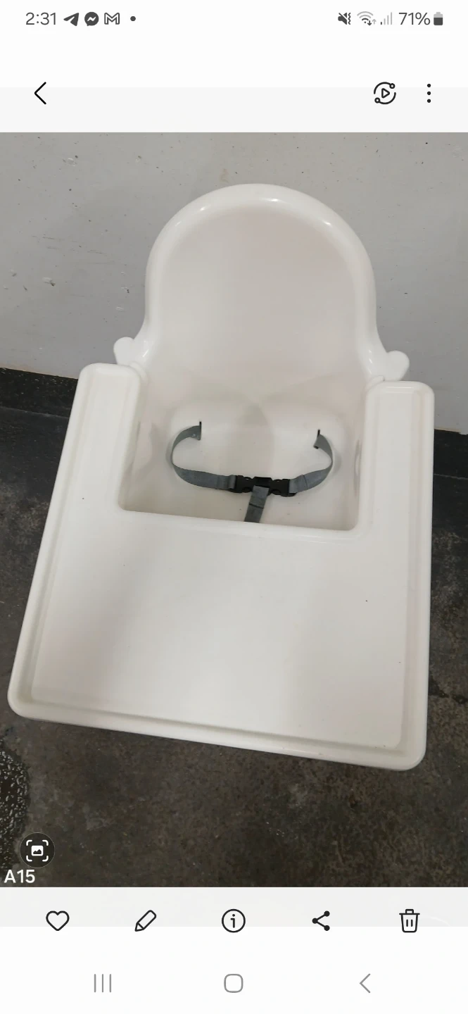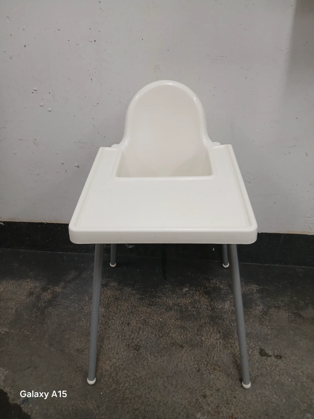 Selling a high chair in great condition! It's perfect for little ones learning to eat at the table. The chair is white with grey legs and is easy to clean. A great addition to any family's mealtime routine