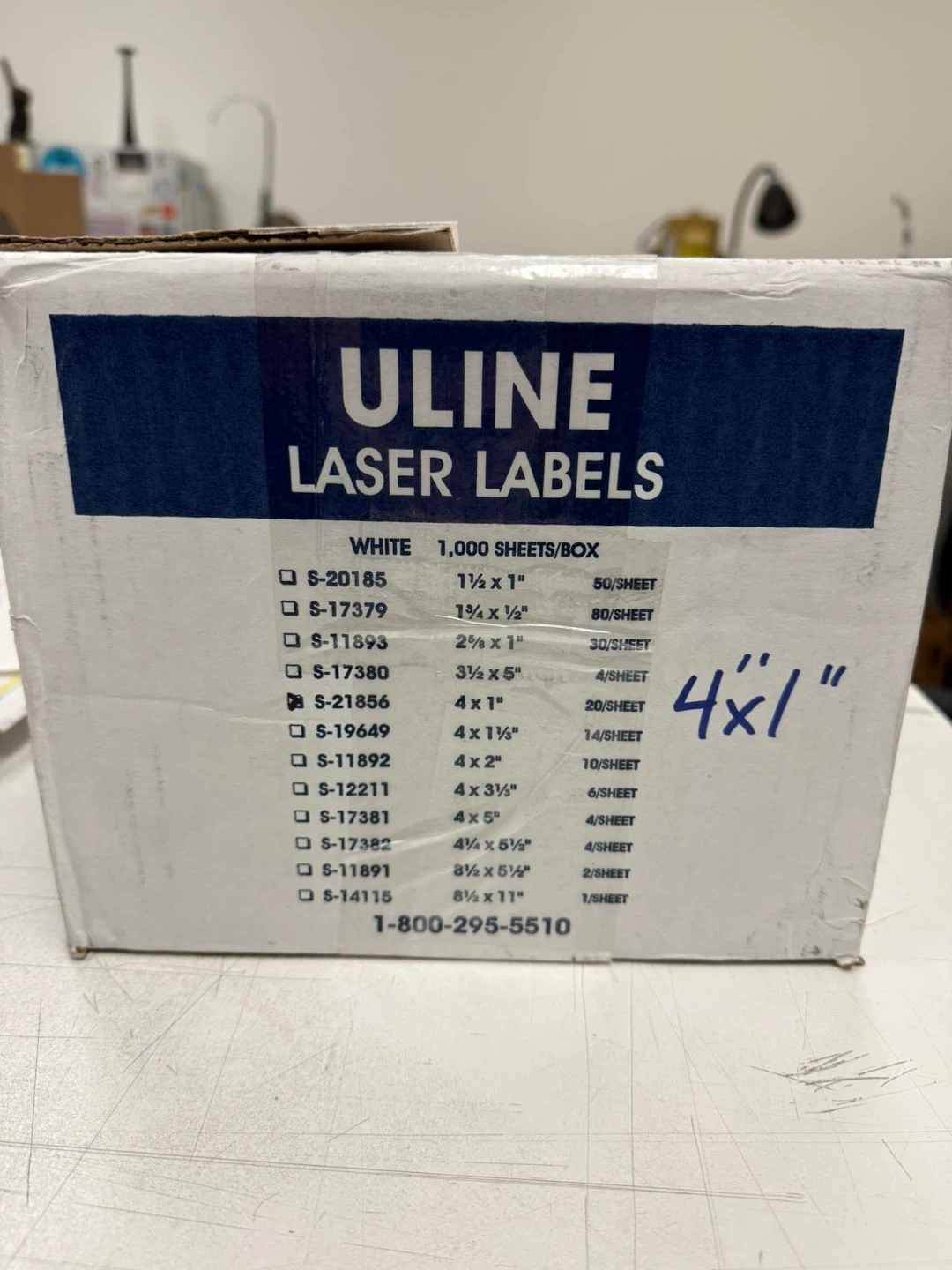 Selling a box of Uline Laser Labels. This is for a group of 20 labels per sheet, total of 6000 labels, 300 sheets. New in box. Pickup Dufferin and Steeles area or shipping available for a fee.