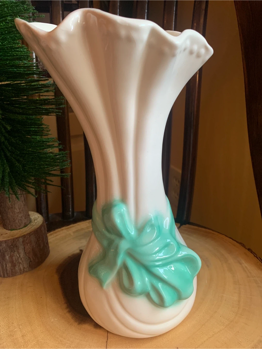 Selling a lovely vintage unique shaped white vase! It features a delicate green accent bow/ribbon that wraps around the vase. It is 10” tall and about 5.5” wide. It has no chips or cracks just one area with a little crazing. Perfect for adding a touch of retro charm to your home decor on a night table, bookshelf or coffee table. Would be great with fresh florals, dried florals or seasonal greenery!