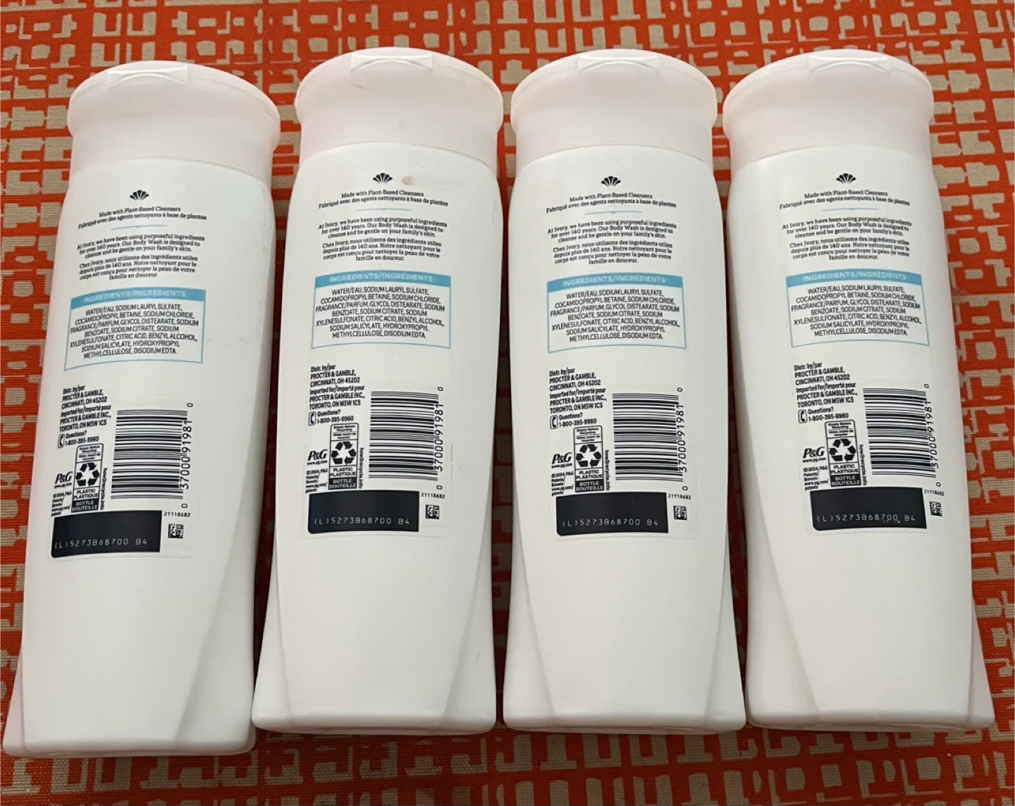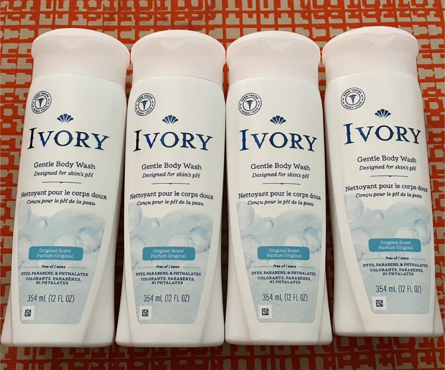 Selling four bottles of Ivory Gentle Body Wash. Each bottle contains 354 mL (12 FL OZ). It is designed for skin's pH and is free of dyes, parabens, and phthalates. Perfect for sensitive skin!