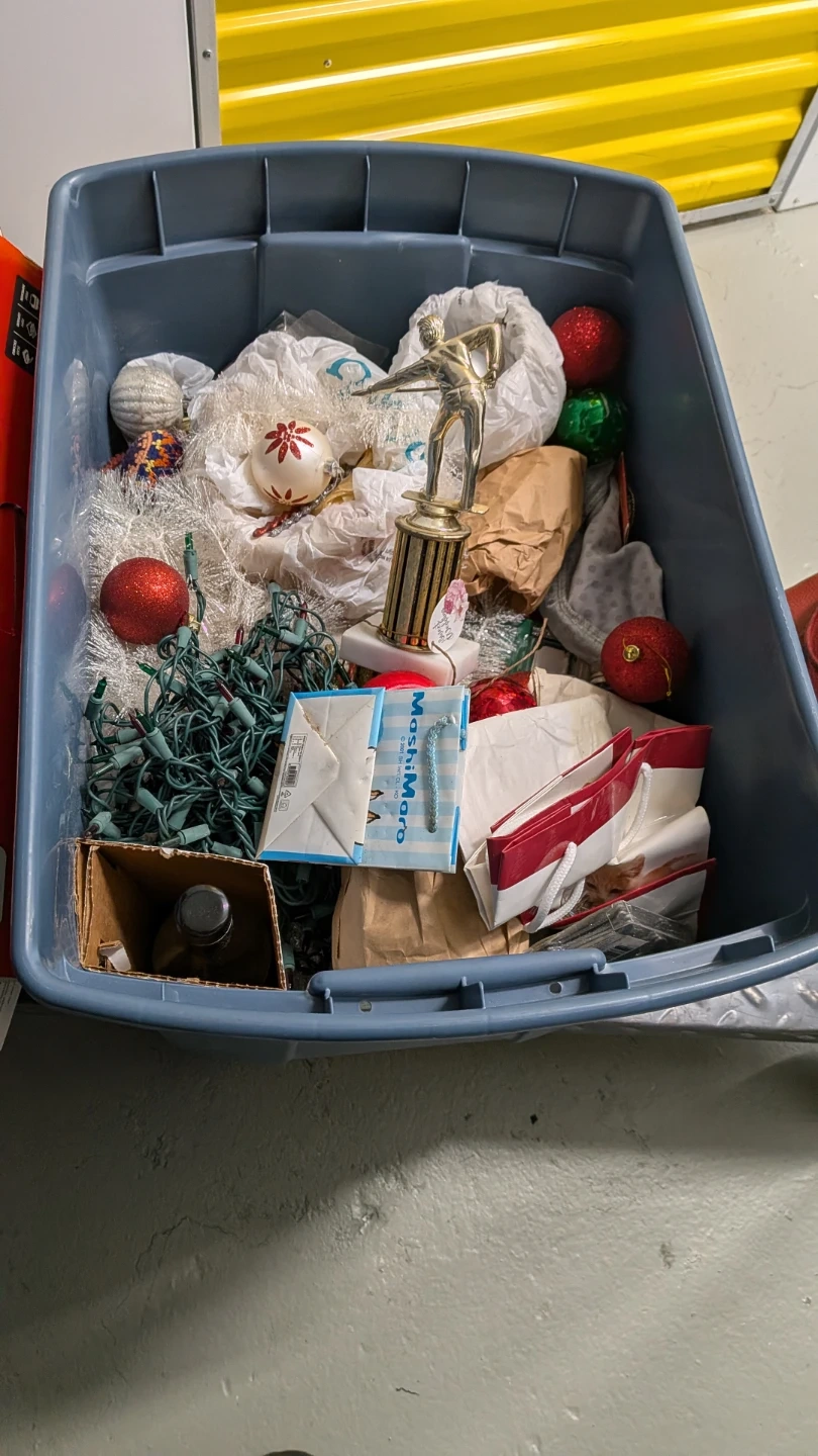 I'm selling a collection of mixed holiday decorations, all neatly stored in a blue bin. The bin includes items such as Christmas ornaments, string lights, and a trophy. Perfect for adding some festive cheer to your home!