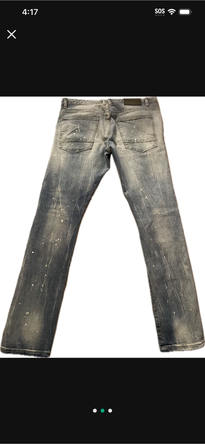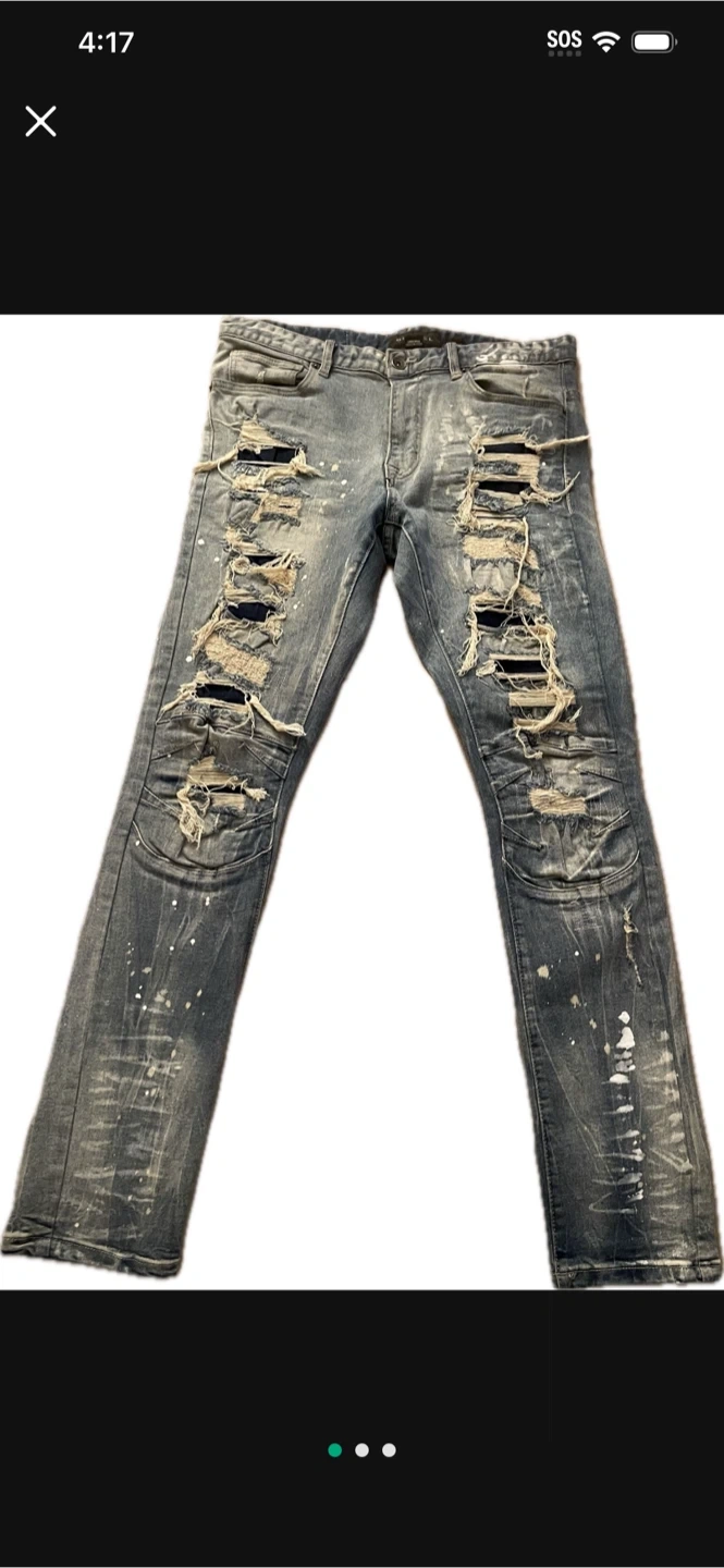Selling a pair of distressed denim jeans. They have a unique, worn look with intentional rips and paint splatter details. Perfect for adding an edgy touch to your wardrobe