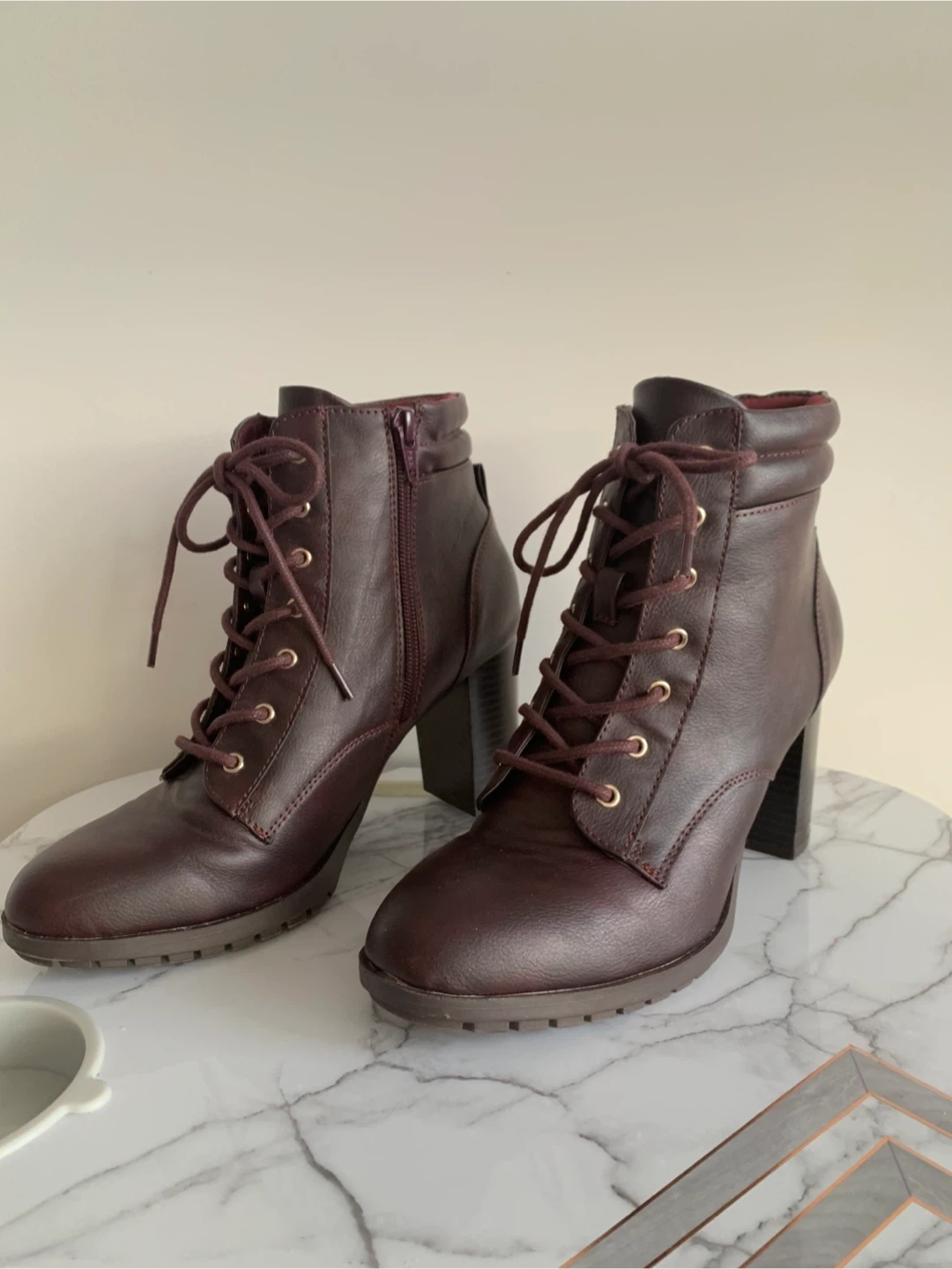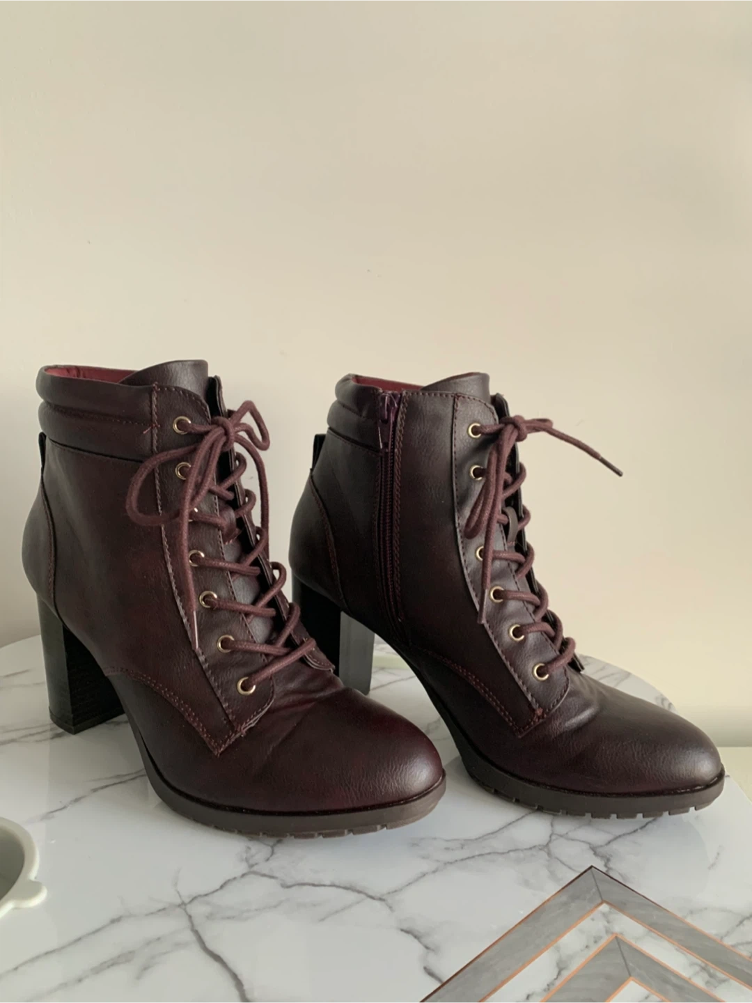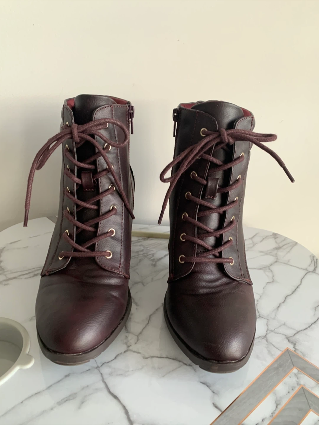 Selling a pair of stylish burgundy lace-up heeled ankle boots w/ a practical zip closure on the inside. They have a great grip/traction outer sole and a heel hight of 3.3”.