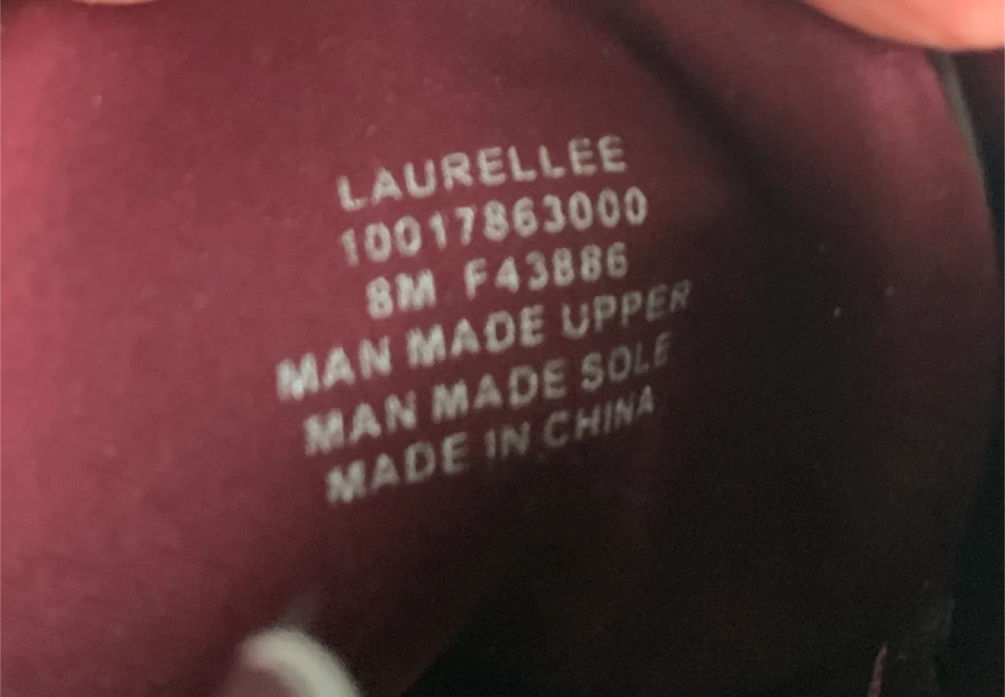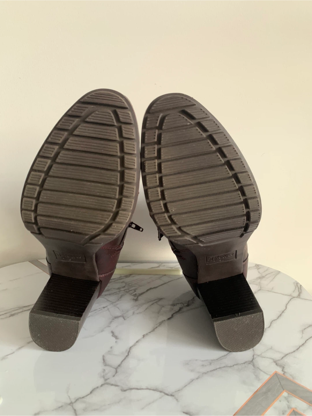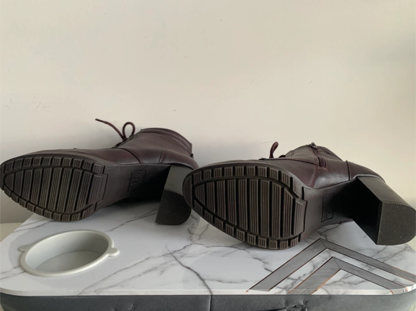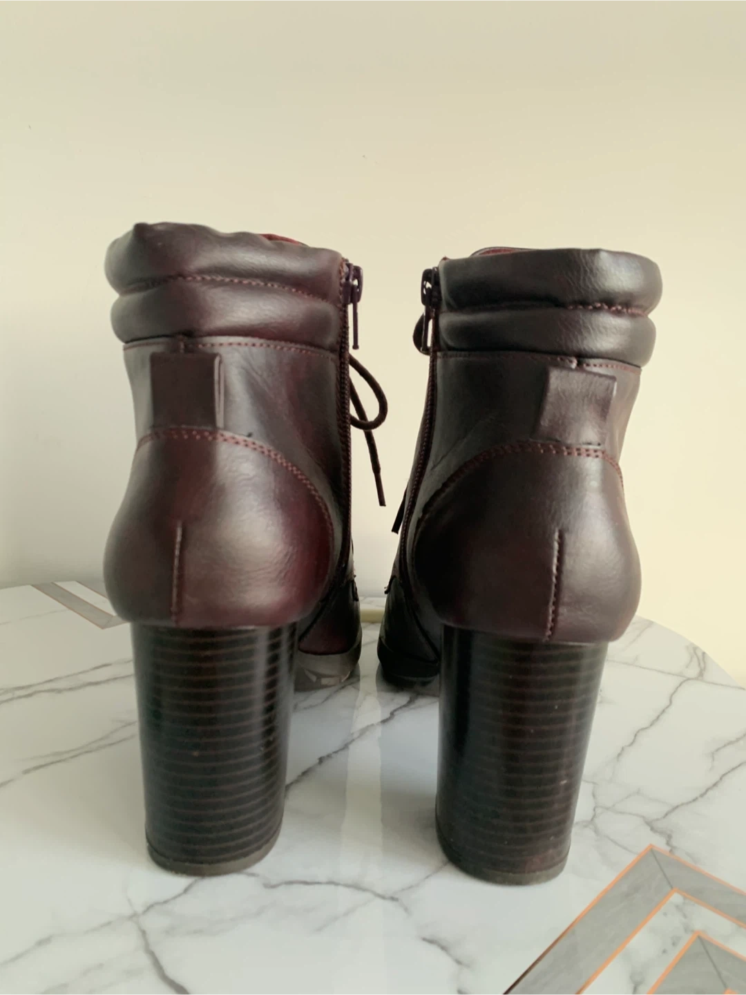 Selling a pair of stylish burgundy lace-up heeled ankle boots w/ a practical zip closure on the inside. They have a great grip/traction outer sole and a heel hight of 3.3”.