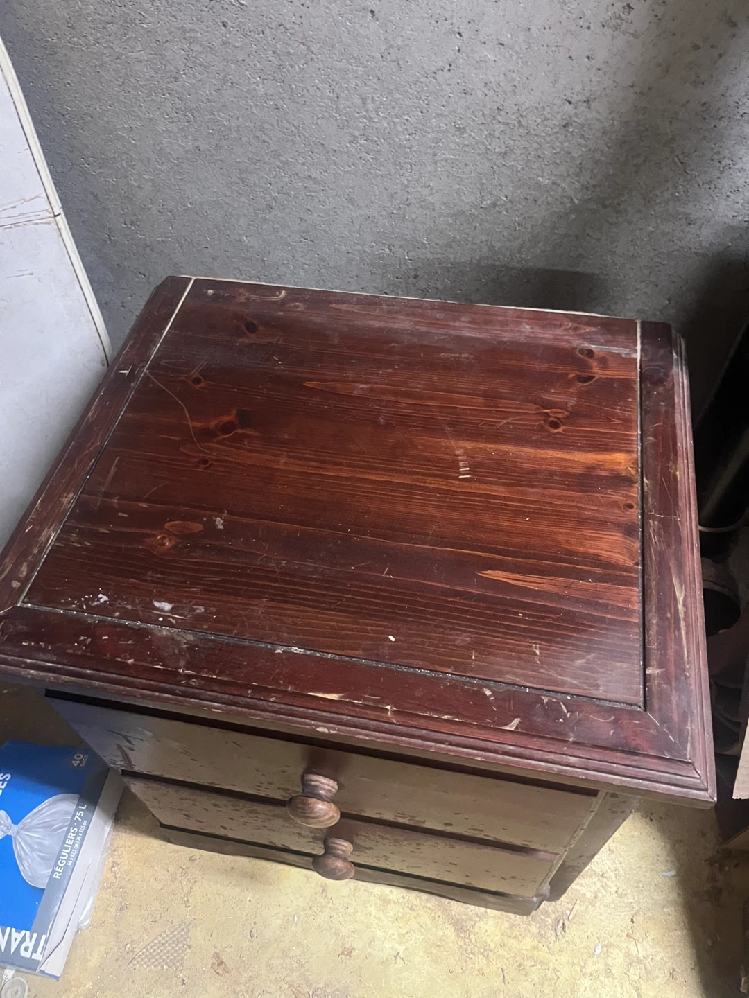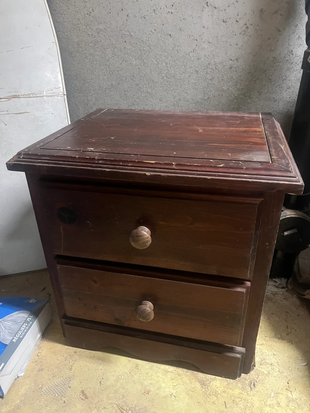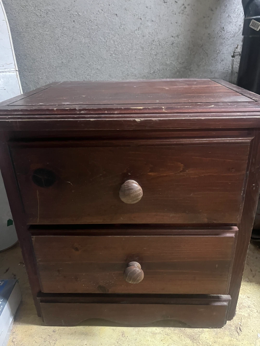 Selling a wooden nightstand with two drawers. It has a dark brown finish and round wooden knobs. There are some signs of wear and tear, but it's still a functional piece of furniture!