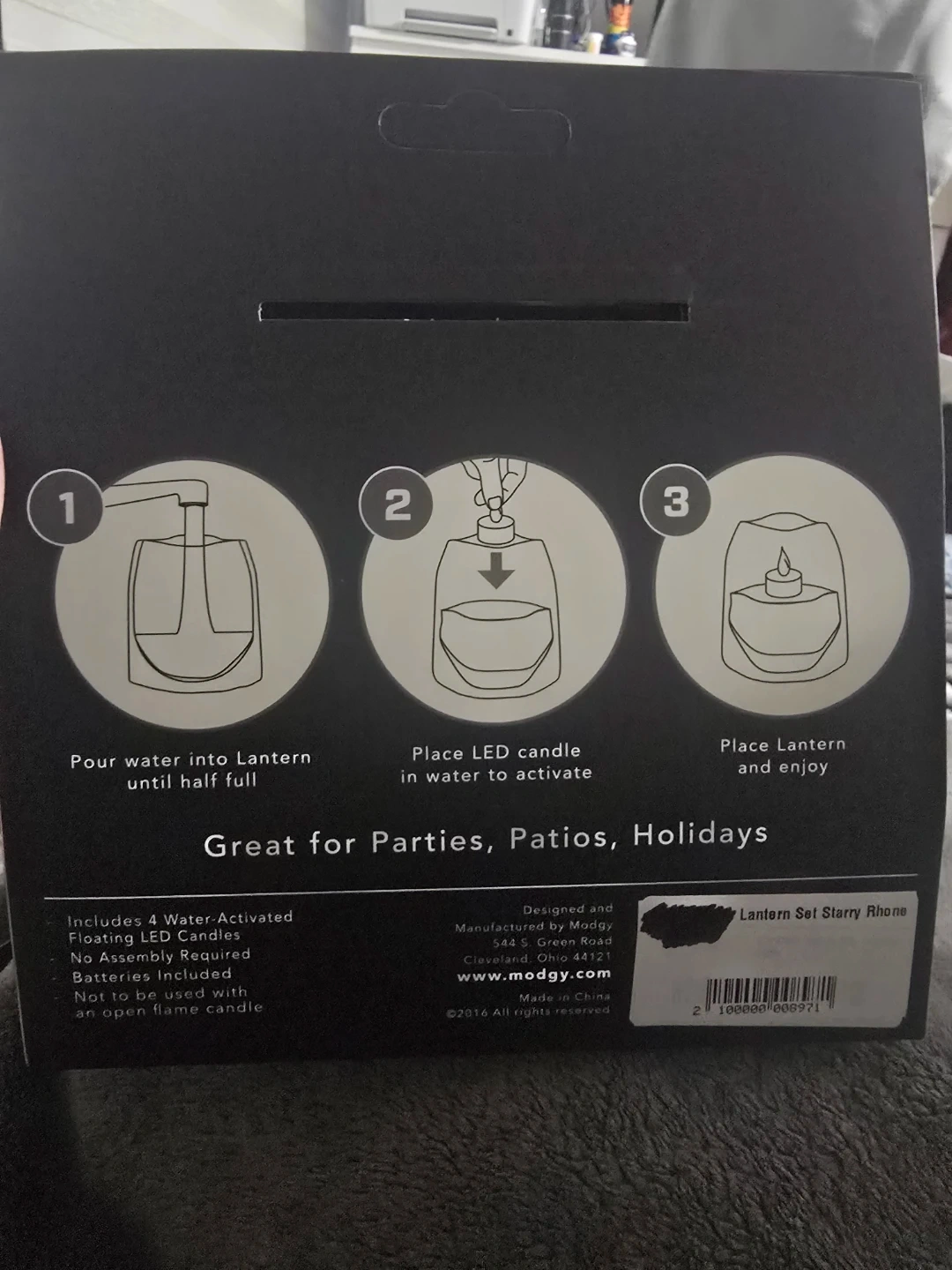 I'm selling a set of Modgy Luminary Lanterns featuring the "Over The Rhone" design. These lanterns include four reusable lanterns and four water-activated floating LED candles. No assembly is required, and batteries are included. They're great for parties, patios, and holidays!
