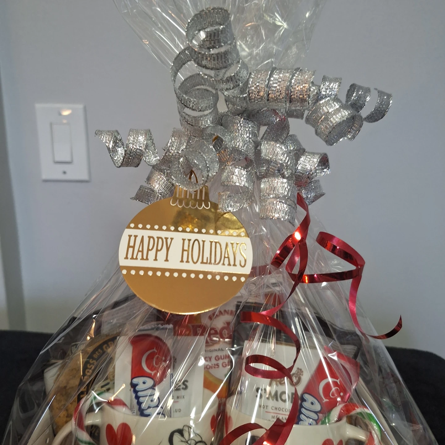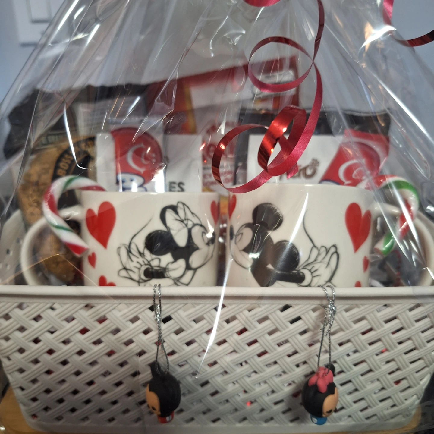 Get ready for the holidays with this adorable gift basket! It includes two Disney-themed mugs featuring Mickey and Minnie Mouse, perfect for enjoying some hot chocolate. Also included are some tasty treats like Frank's RedHot gummies, Aero S'mores chocolate, Big Daddy cookies, and candy canes. This basket is sure to bring some holiday cheer!