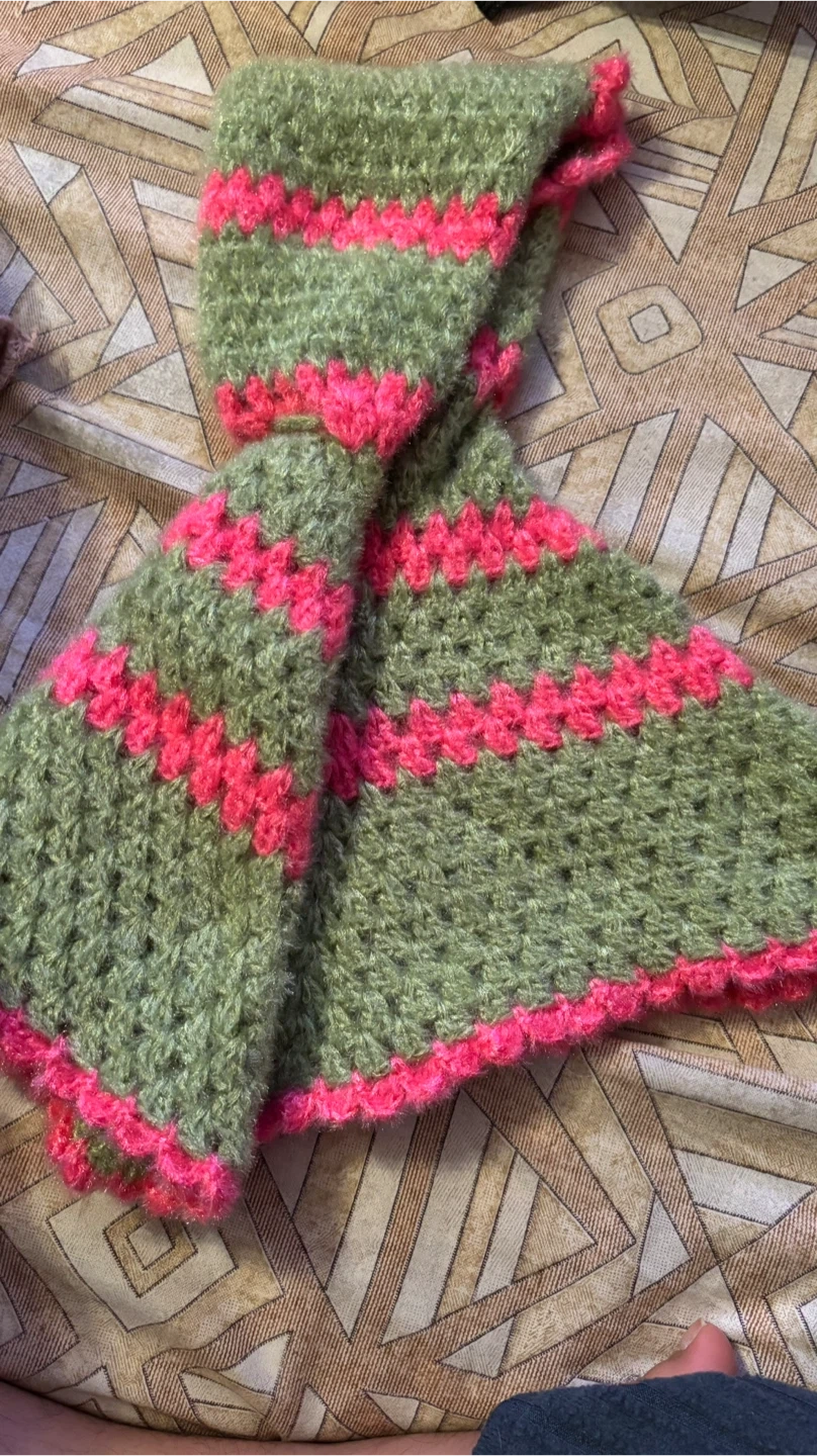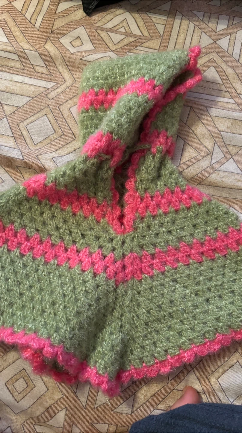 Selling a super cute handmade crocheted hooded poncho! It's a unique piece with a lovely green and pink colour combination. Perfect for keeping your little one warm and stylish.