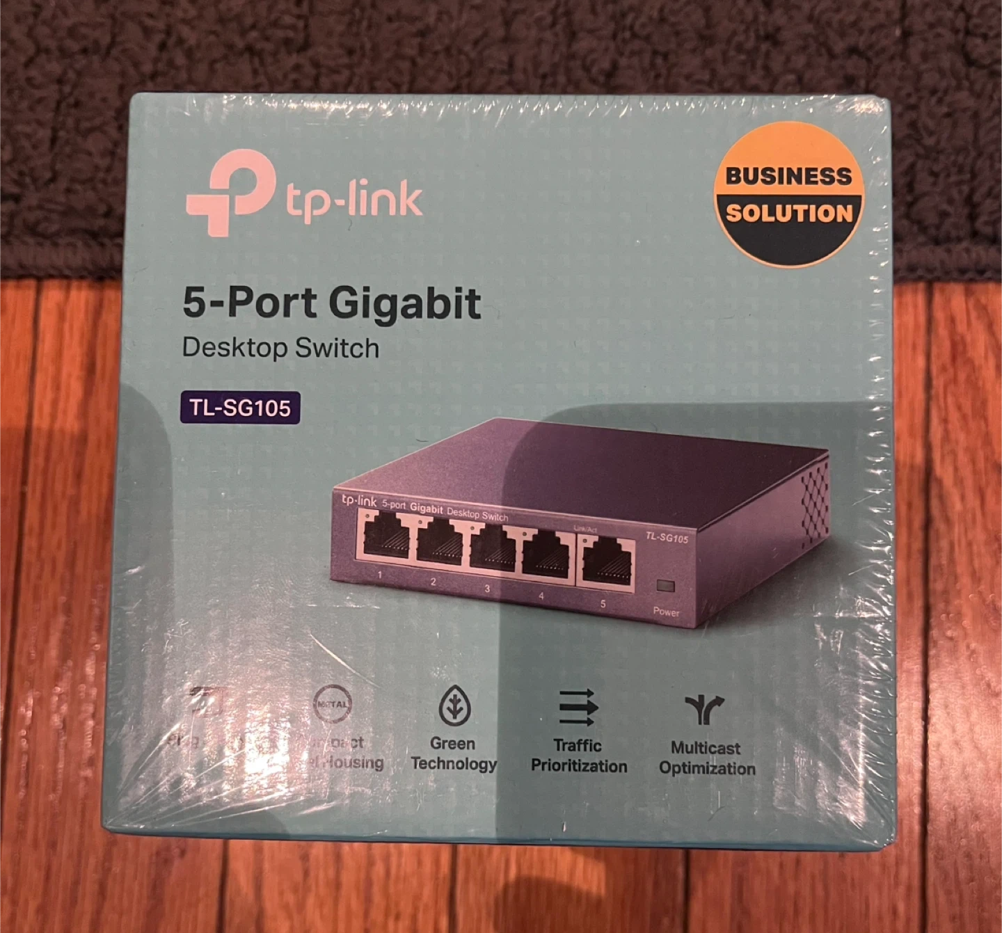 Selling a brand new TP-Link 5-Port Gigabit Desktop Switch, model TL-SG105. It's still in its original packaging and has never been used. This switch offers traffic prioritization and multicast optimization, and features green technology and a metal housing. Perfect for expanding your network!