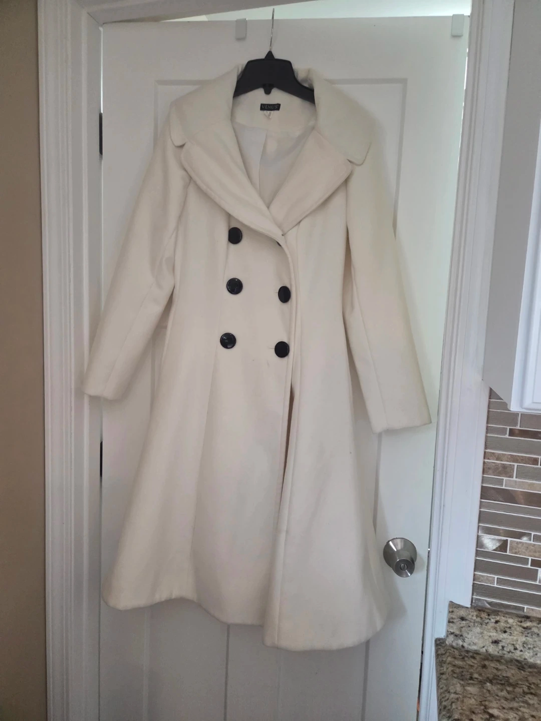 Venus coat in a classic white color. It's a double-breasted style with black buttons. This outerwear piece offers a sophisticated look.