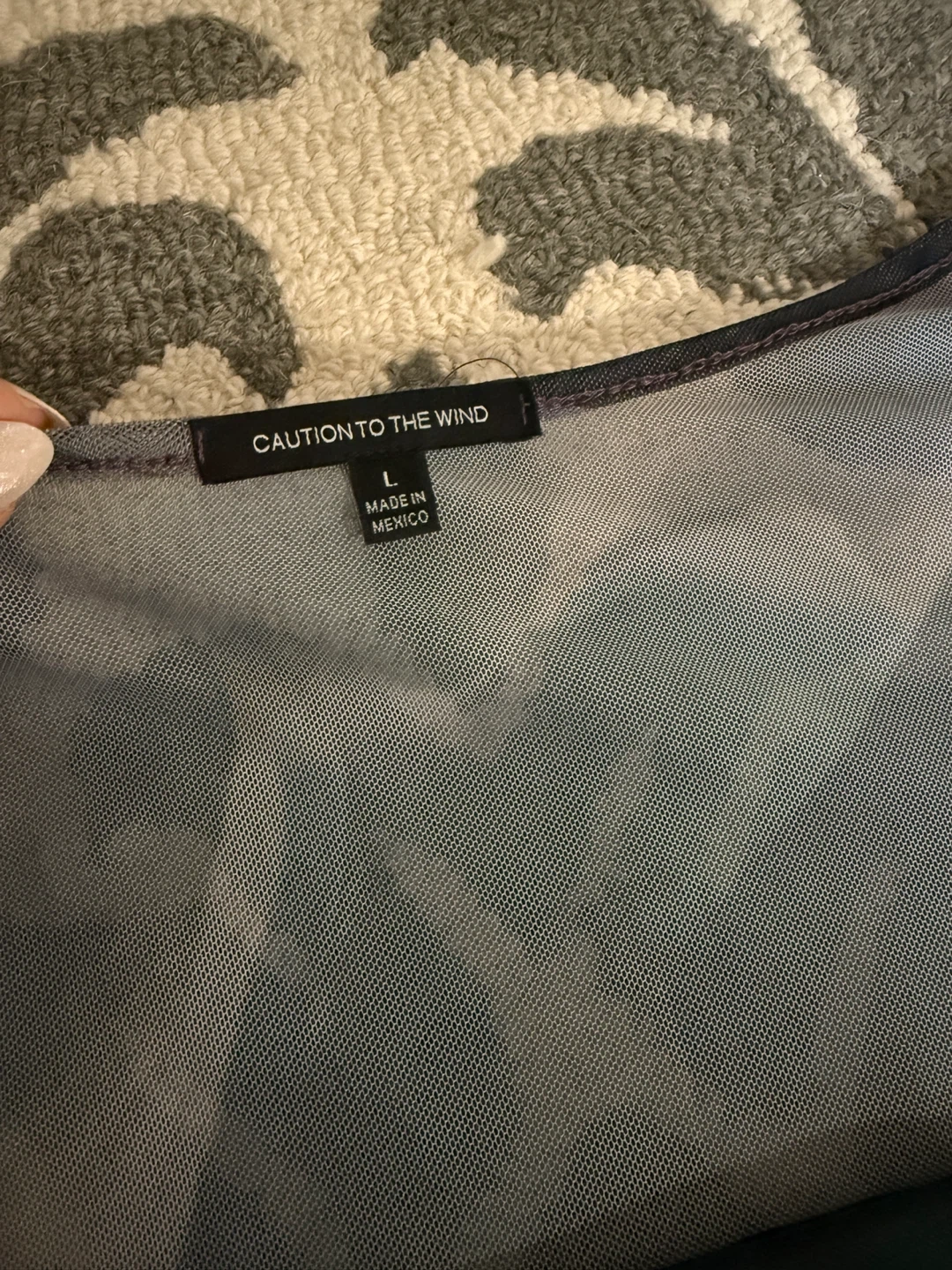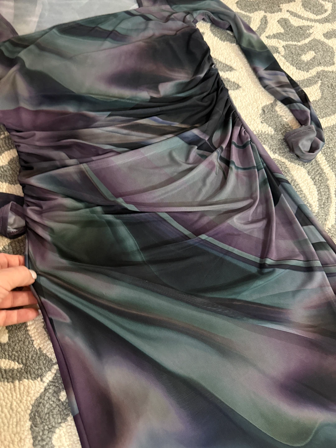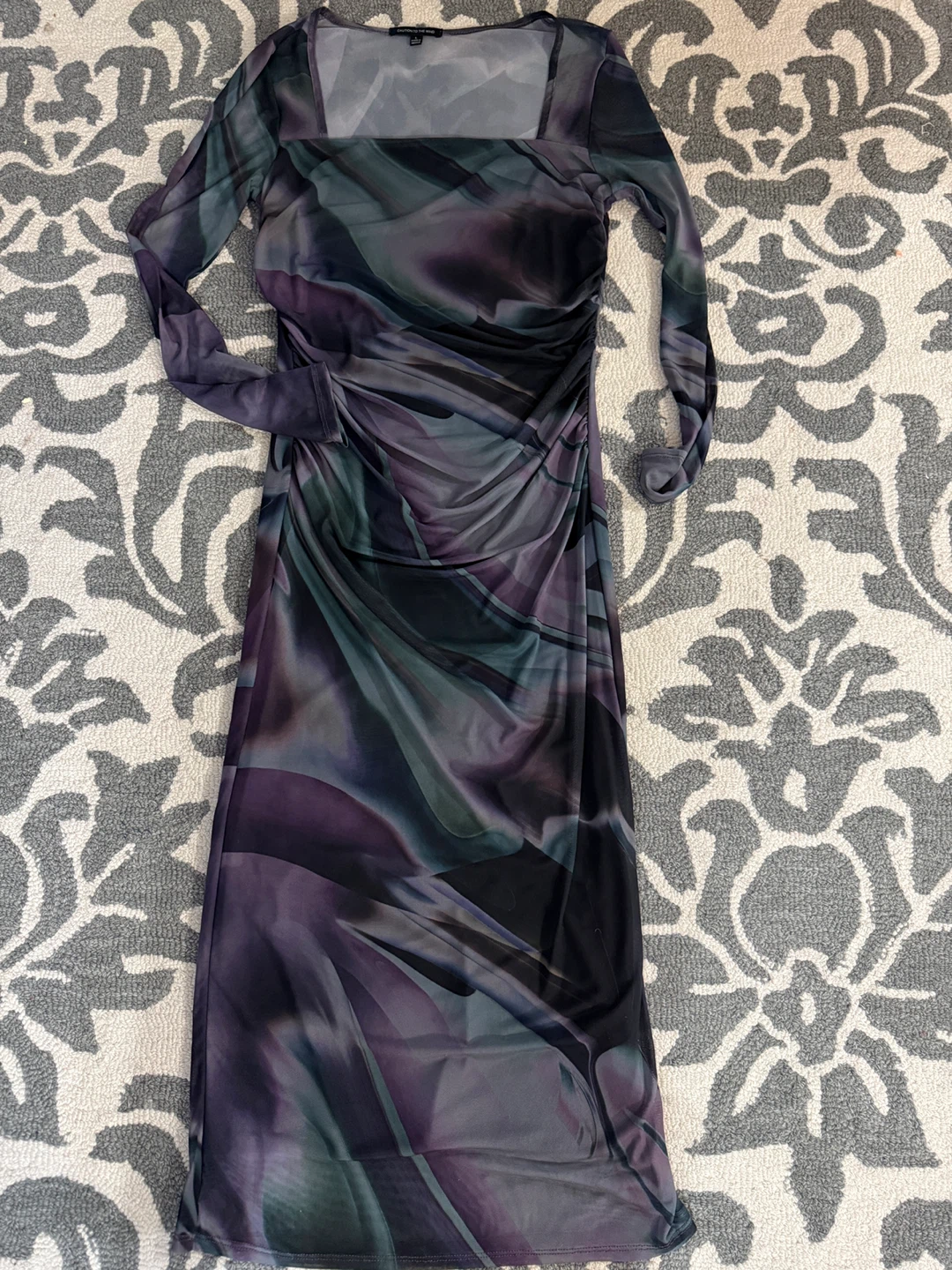 Selling a Caution to the Wind dress in size large. It's a unique piece with a beautiful, flowing design in shades of purple, grey, and black. Perfect for a night out or a special occasion!