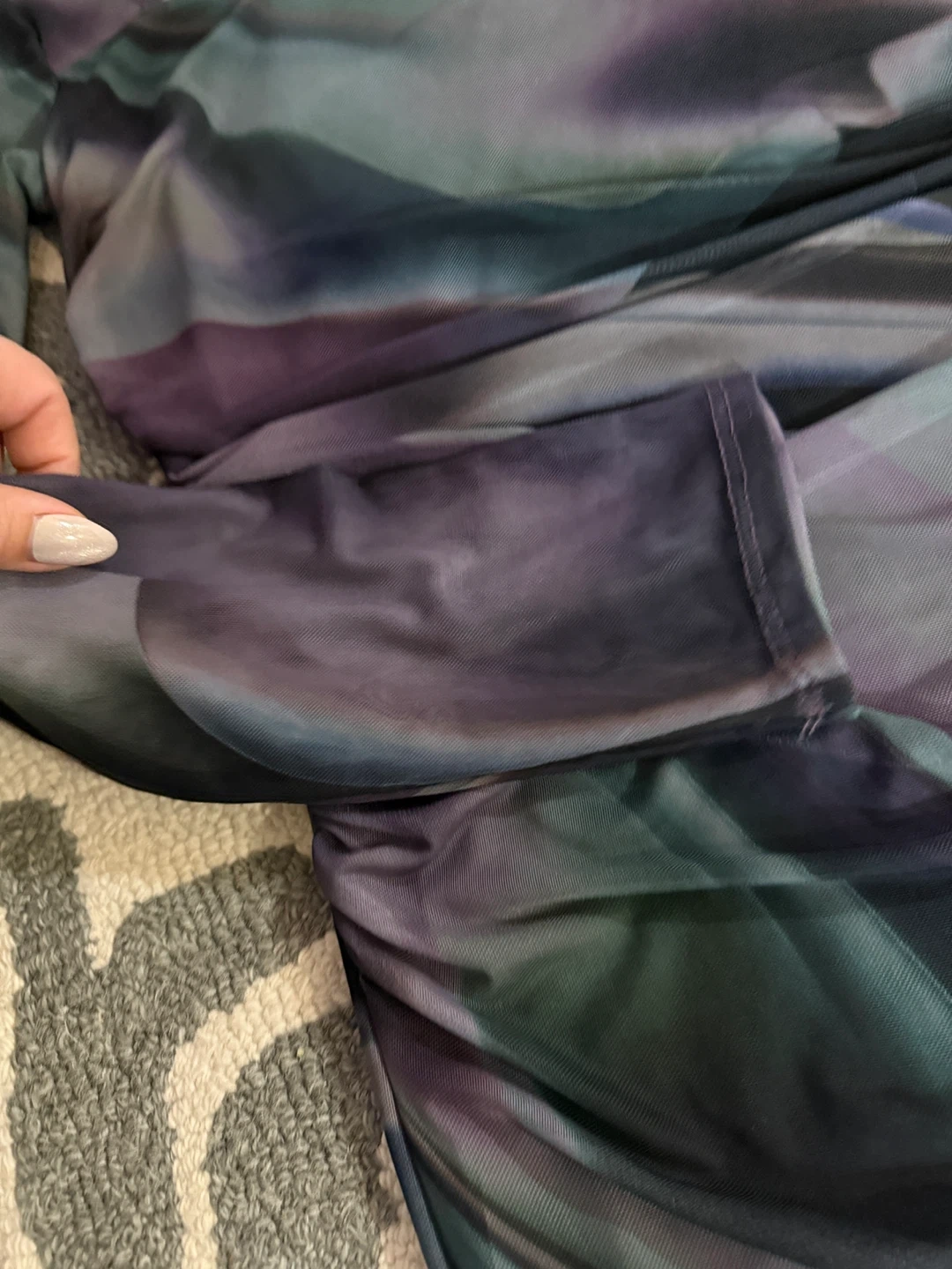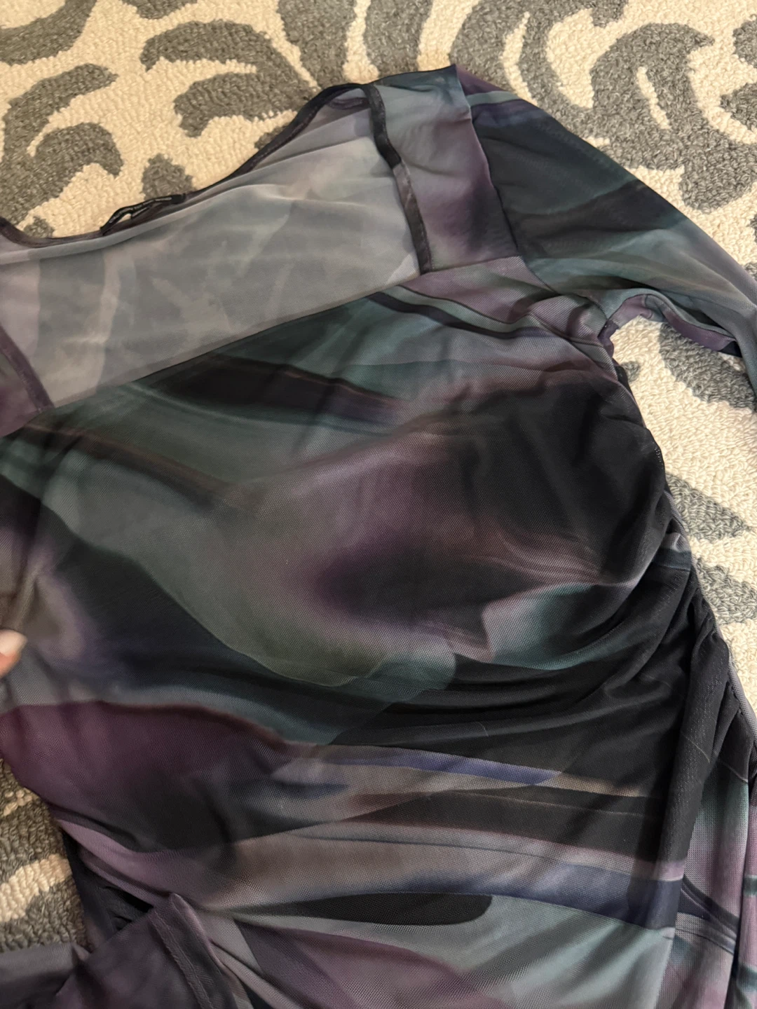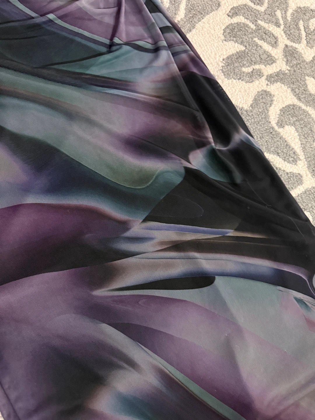 Selling a Caution to the Wind dress in size large. It's a unique piece with a beautiful, flowing design in shades of purple, grey, and black. Perfect for a night out or a special occasion!