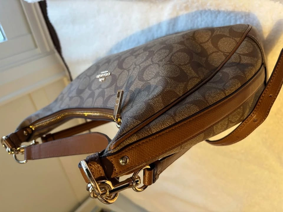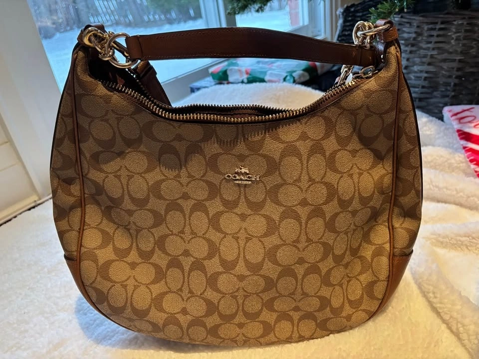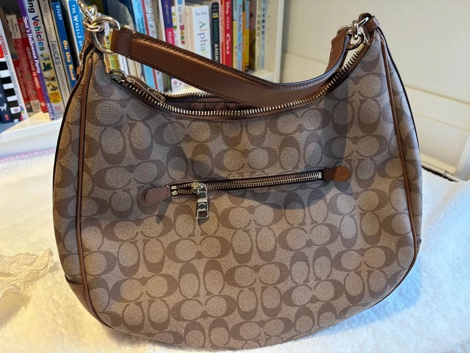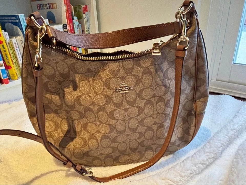 Coach Harley Hobo bag in signature canvas with leather trim and gold-tone hardware in excellent condition.