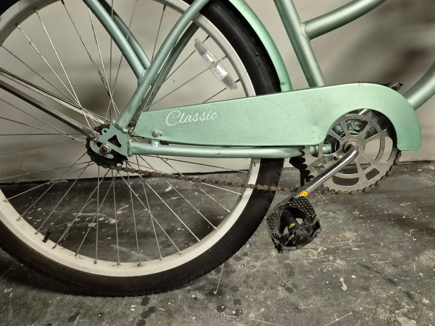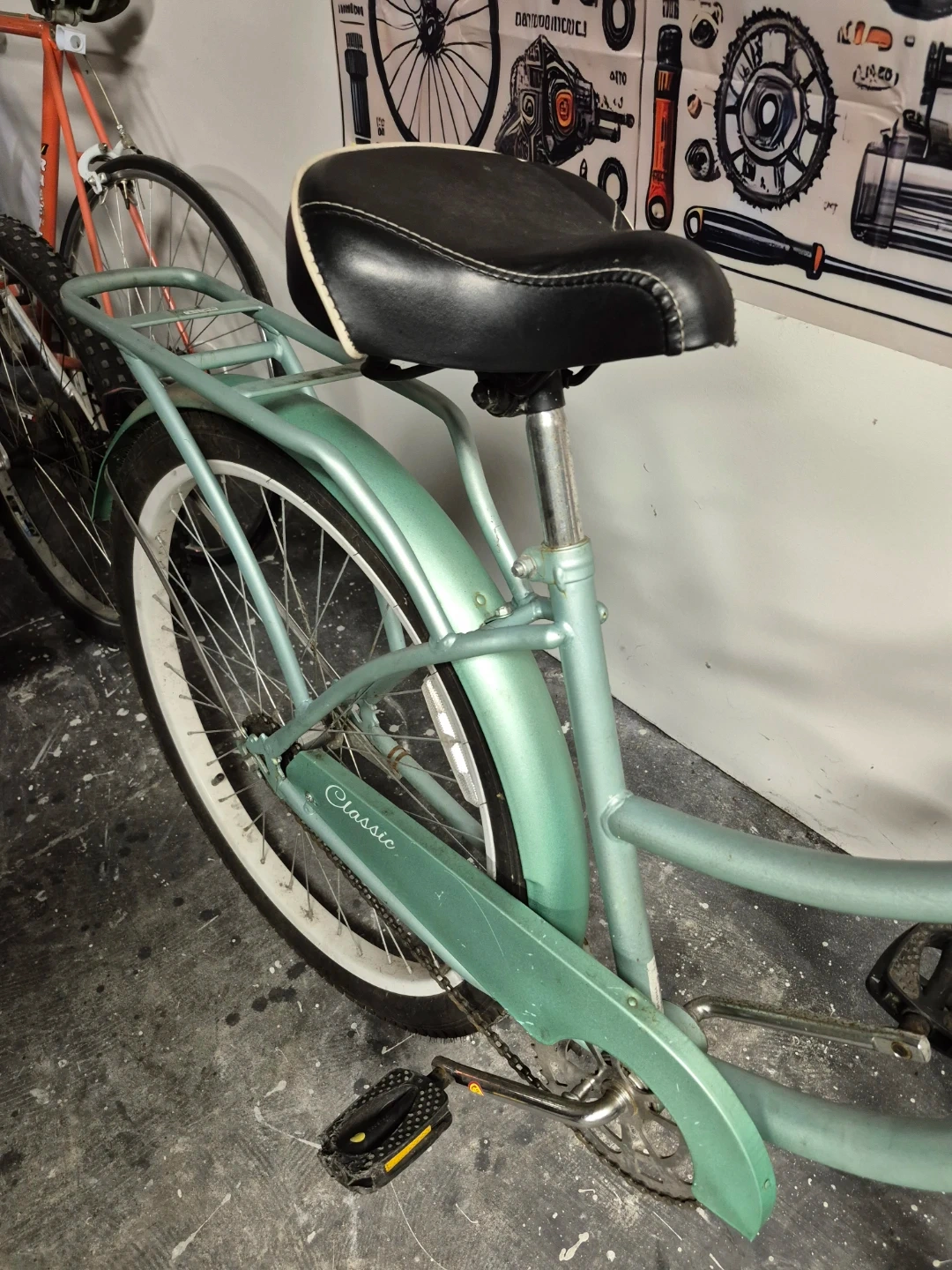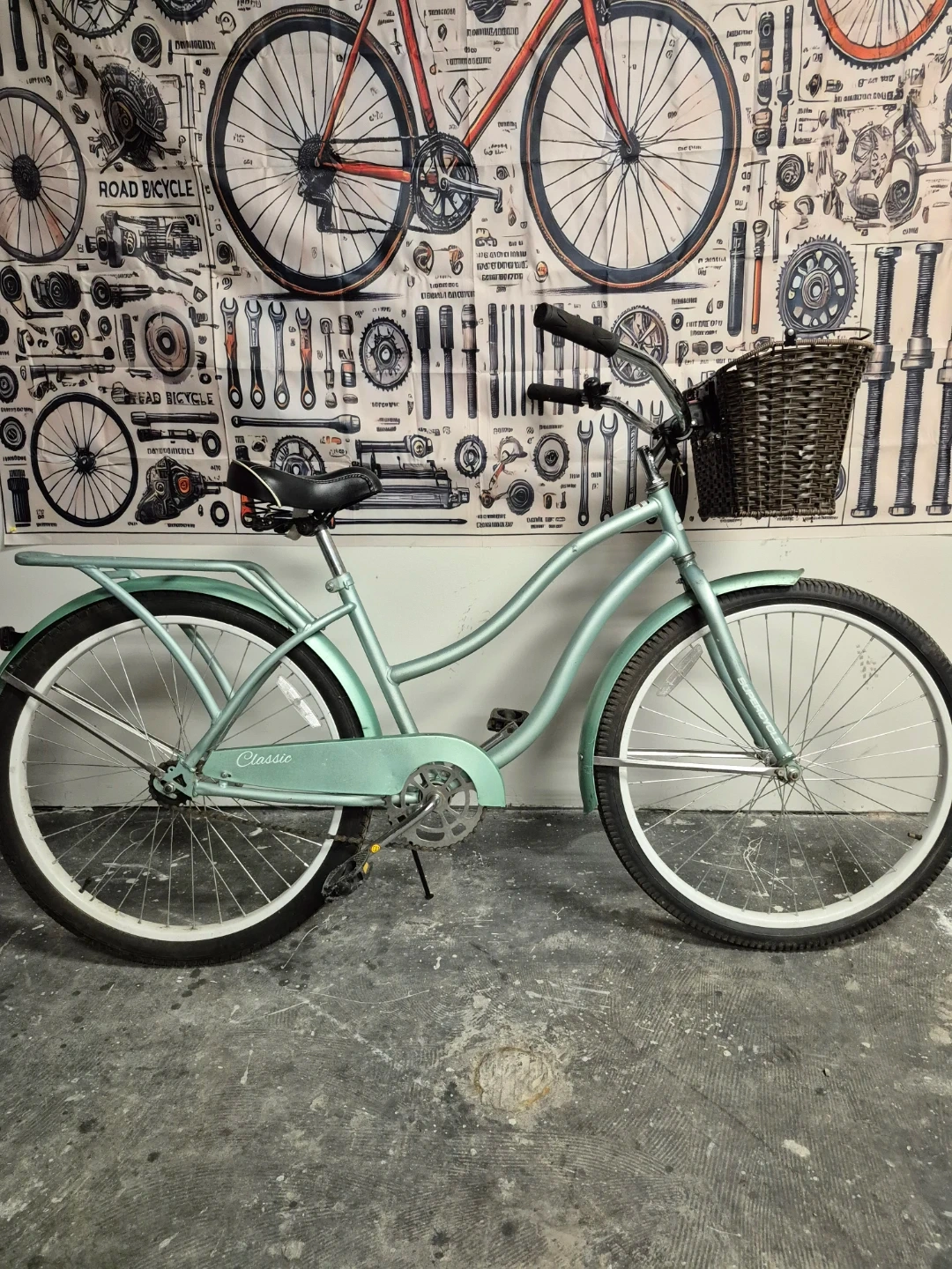 Selling a charming mint green cruiser bike! It's a Classic model and comes with a cute basket, perfect for carrying your essentials on leisurely rides. The bike is in good condition and ready for a new owner to enjoy some sunshine and fresh air All of our bicycles are serviced and mechanically warrantied for 14 days Available at The Up-Cycle 2854 Ellesmere Road, Scarborough Call or text 6473896420