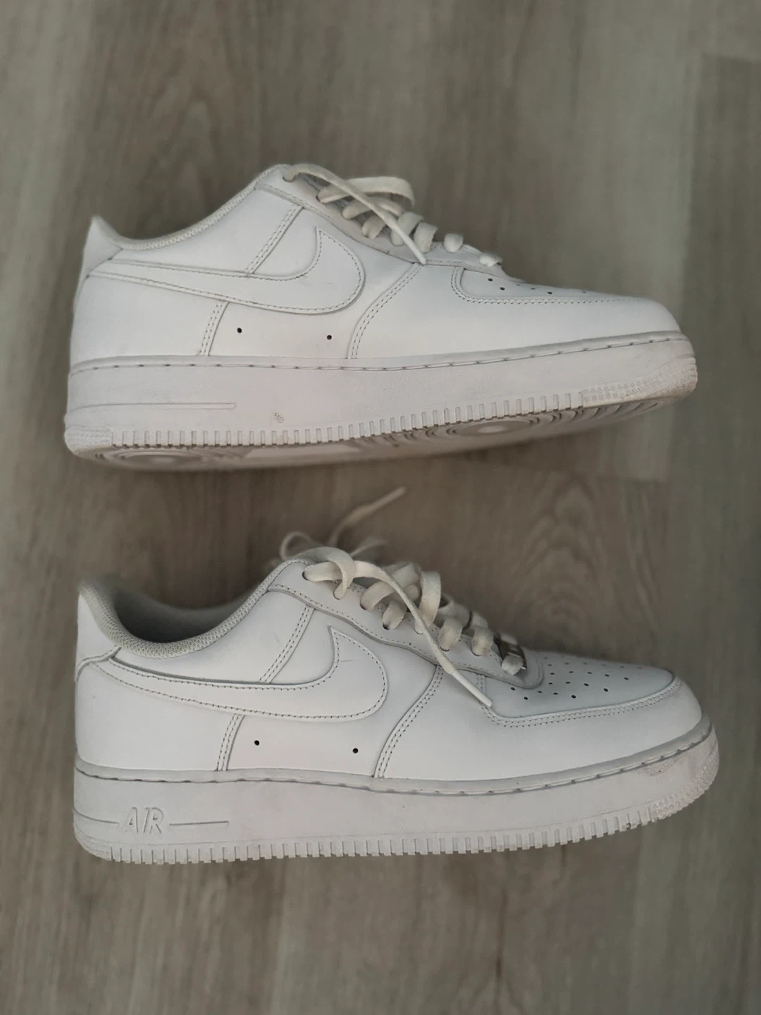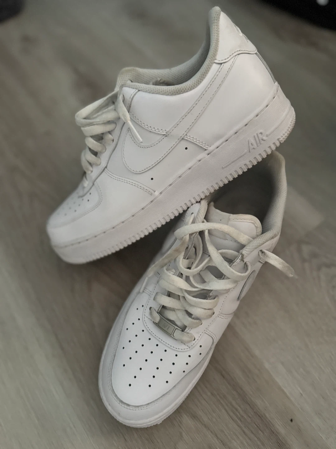 Pair of classic Nike Air Force 1 sneakers in white. Great condition! Size 9.5M