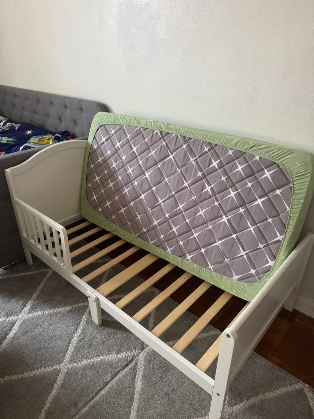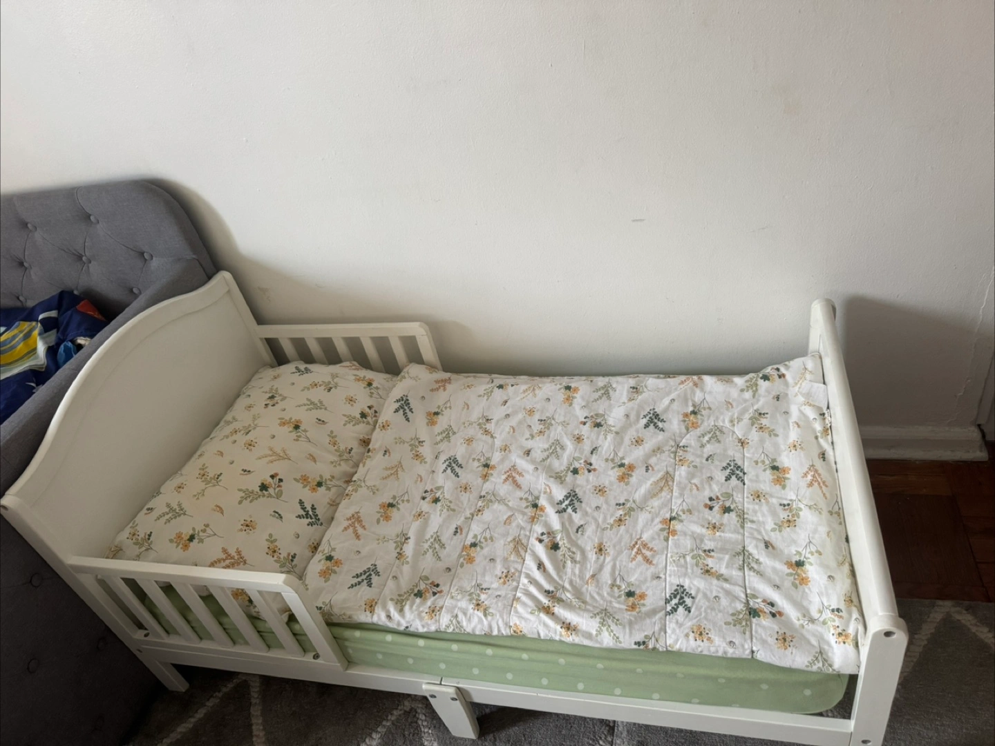 Selling a toddler bed in great condition! It's perfect for transitioning your little one from a crib to a bed. The bed frame is white and sturdy. It comes with a mattress and cute 4 pcs 100% cotton bedding set. Ready for a new home!
