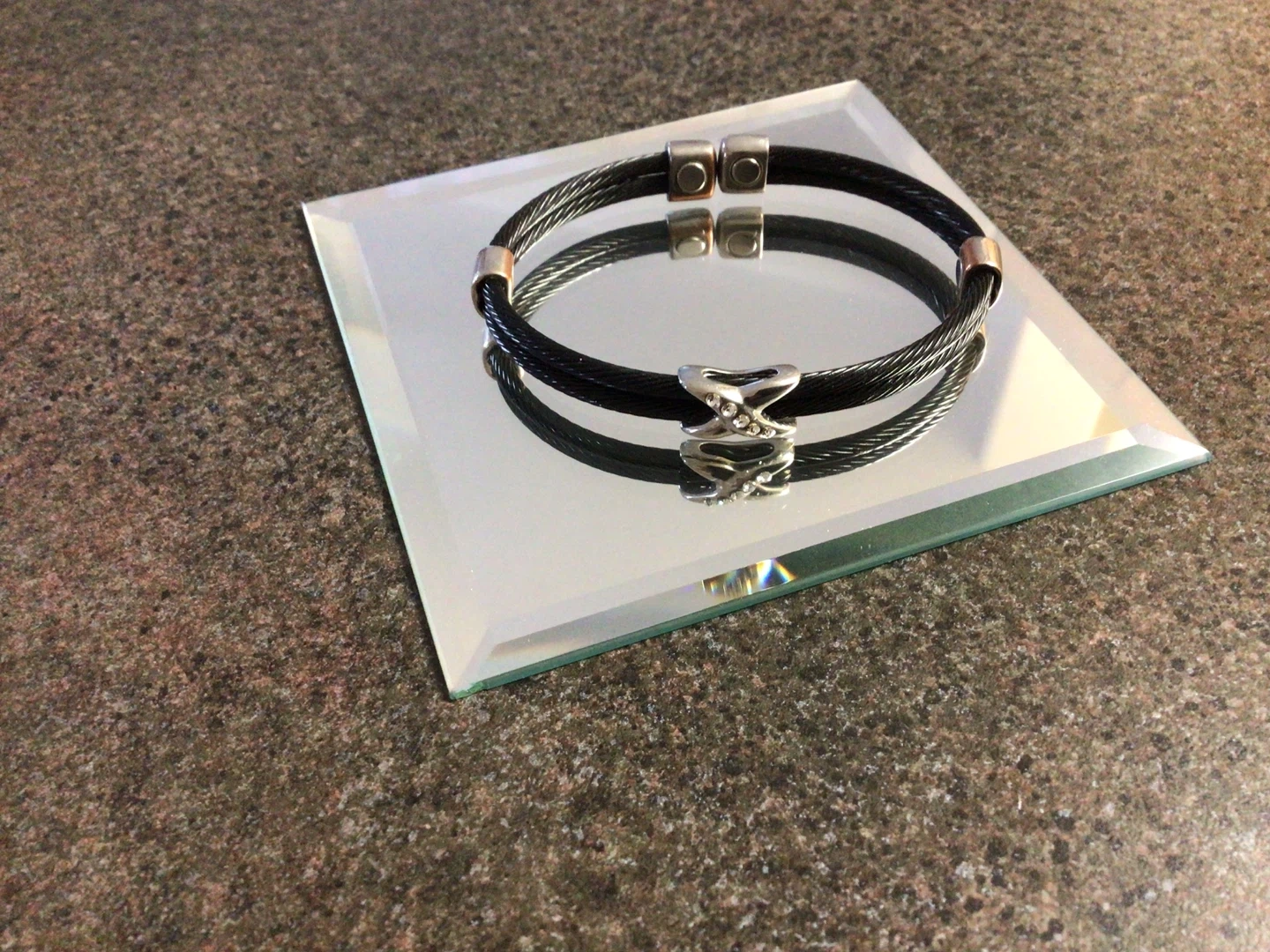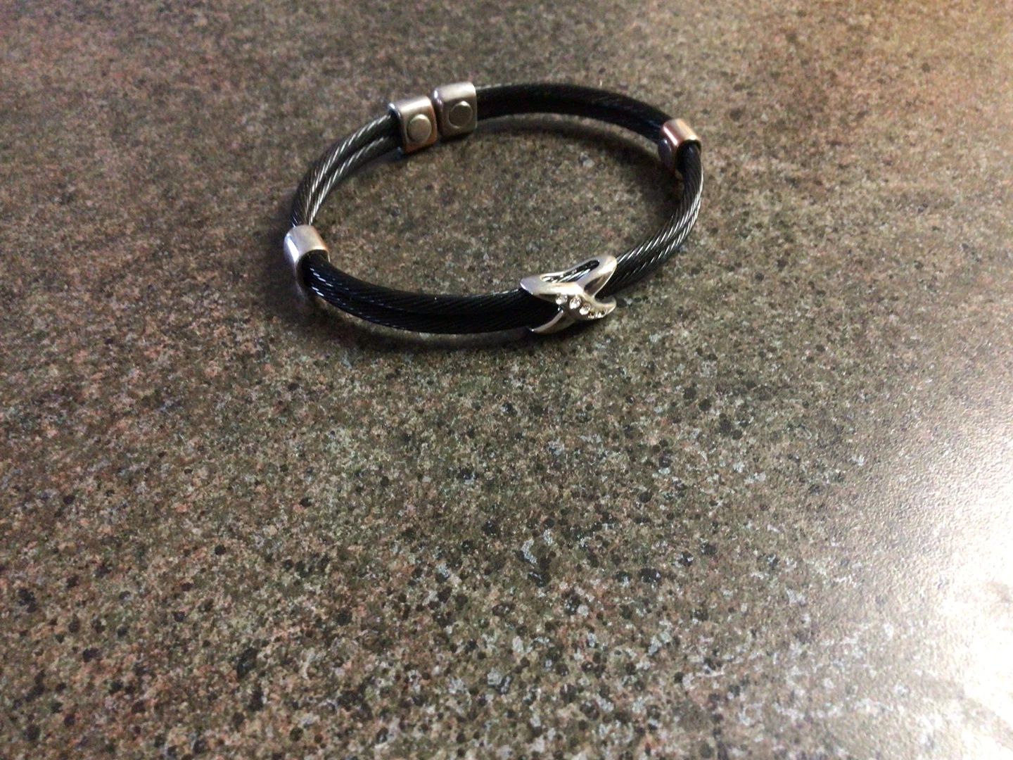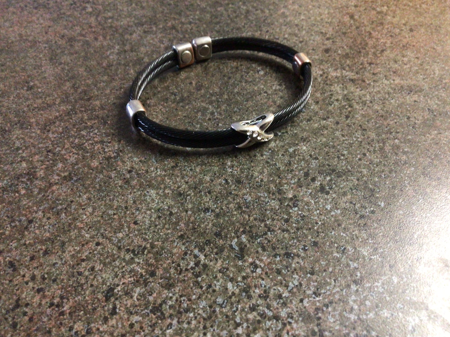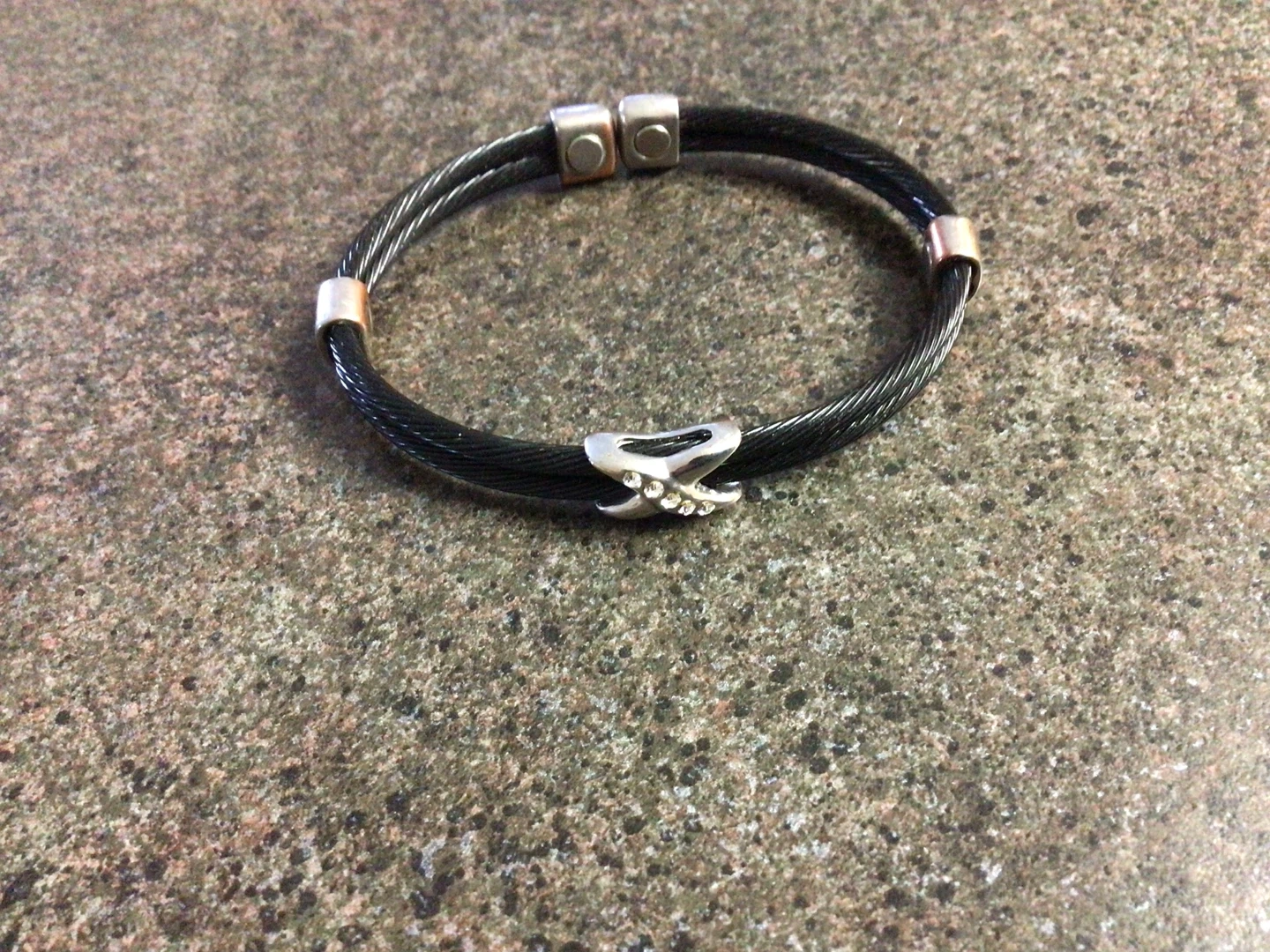 Selling a stylish black bracelet with silver-tone accents! It features a unique design with a decorative centerpiece. A great accessory to add a touch of flair to any outfit!