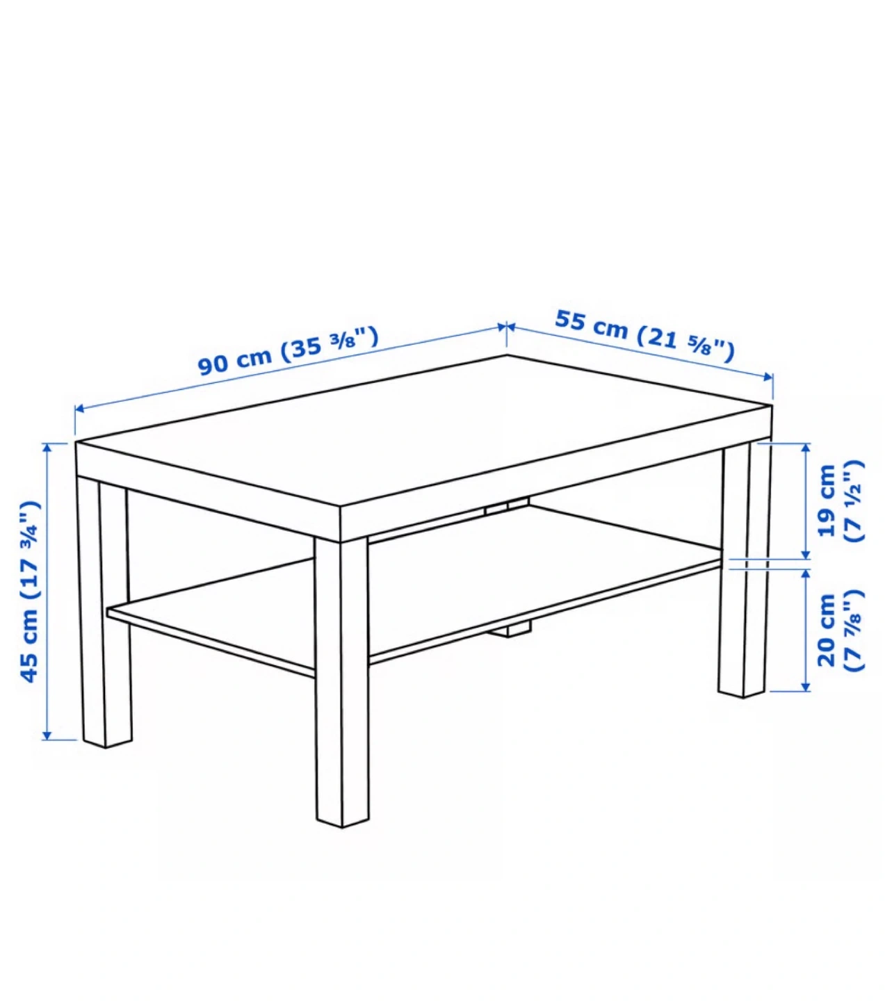 Selling a dark brown IKEA Lack coffee table. It’s in great shape and ready for a new living room! The table measures 90 cm (35 3/8") in length, 55 cm (21 5/8") in width, and 45 cm (17 3/4") in height
