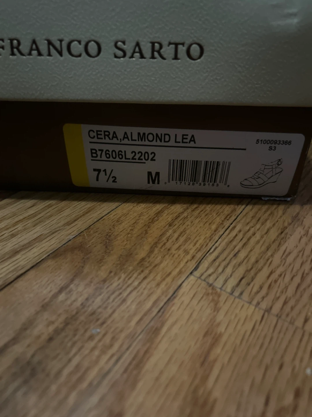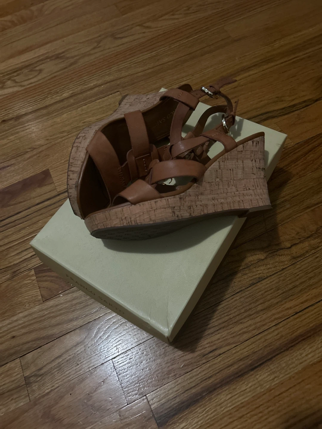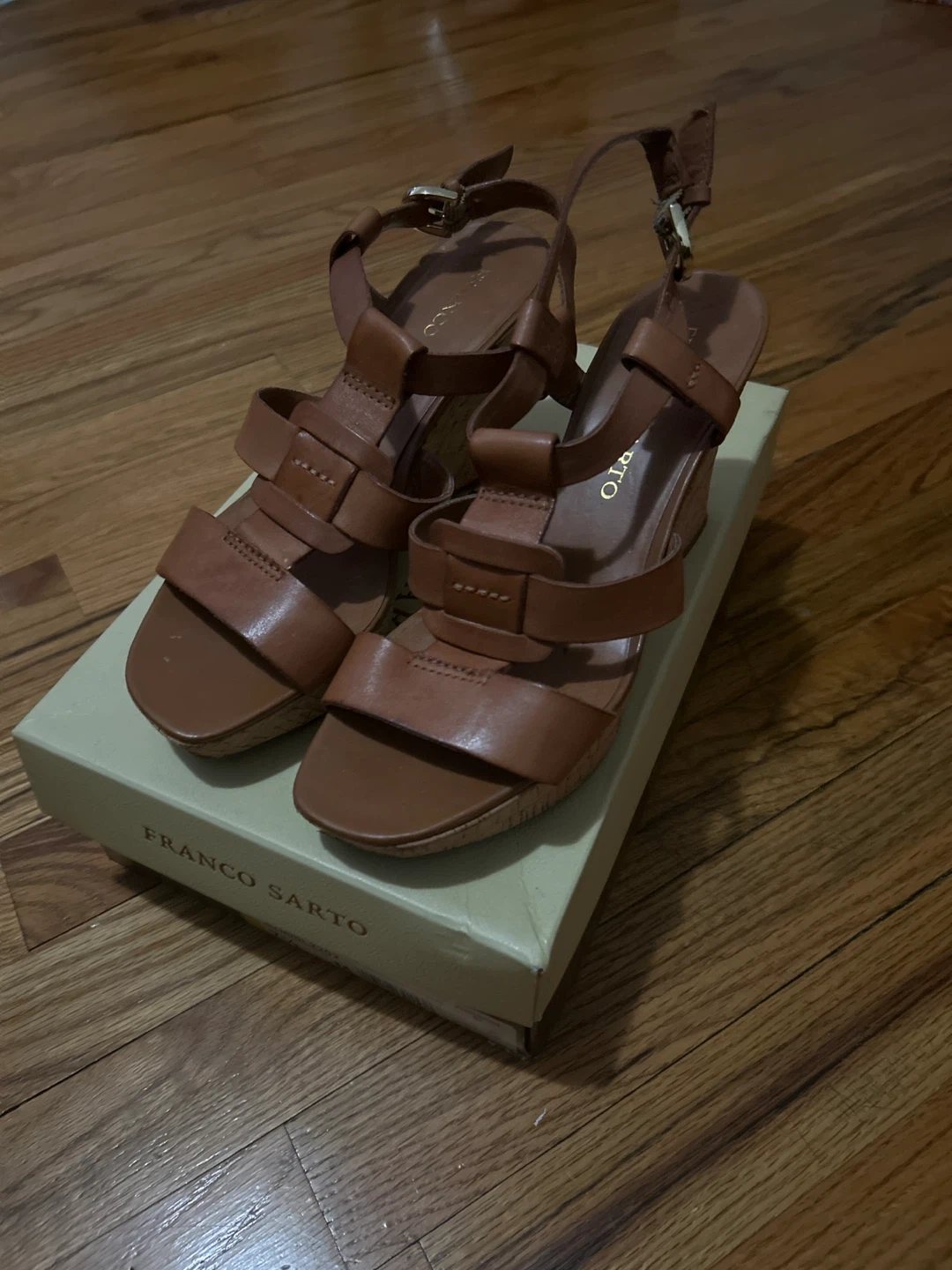 Franco Sarto Cera wedge sandals in almond leather, size 7.5M. These stylish wedges come with their original box, worn but in 8/10 condition.