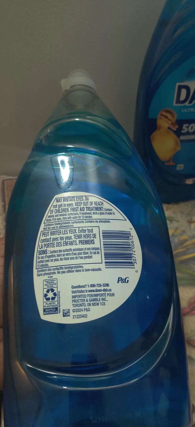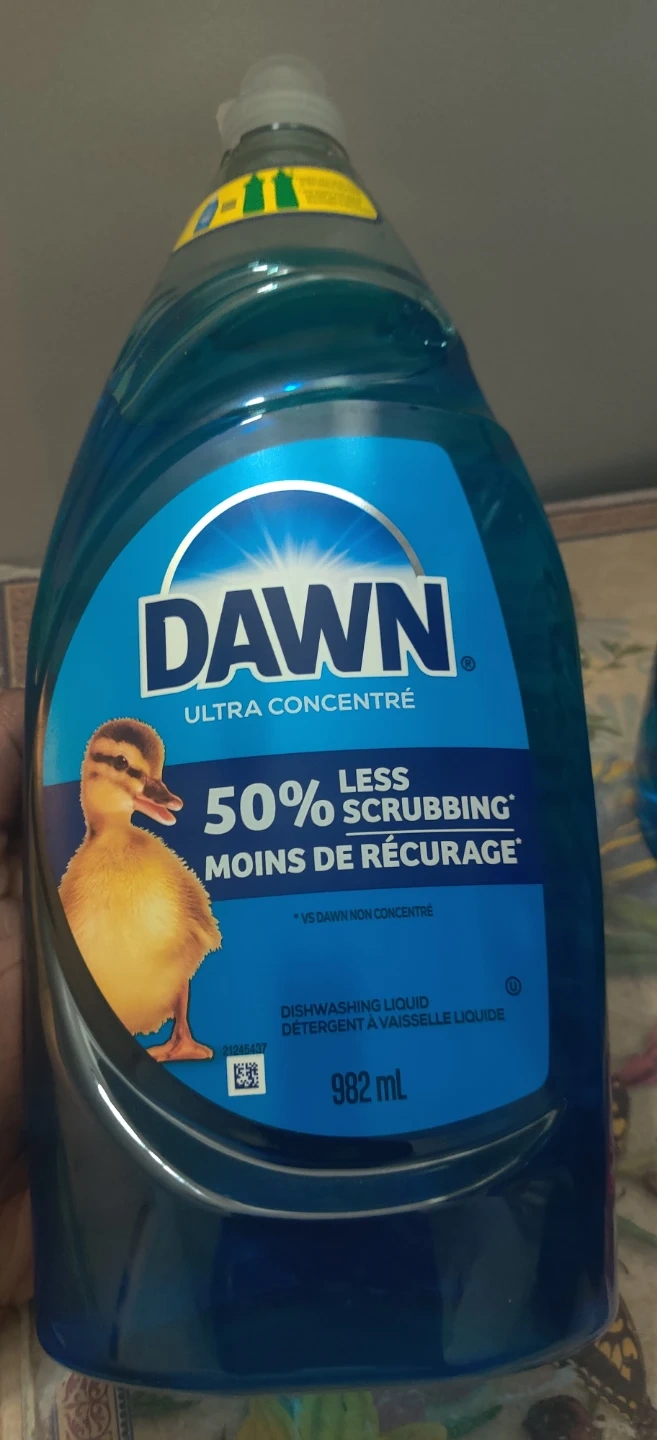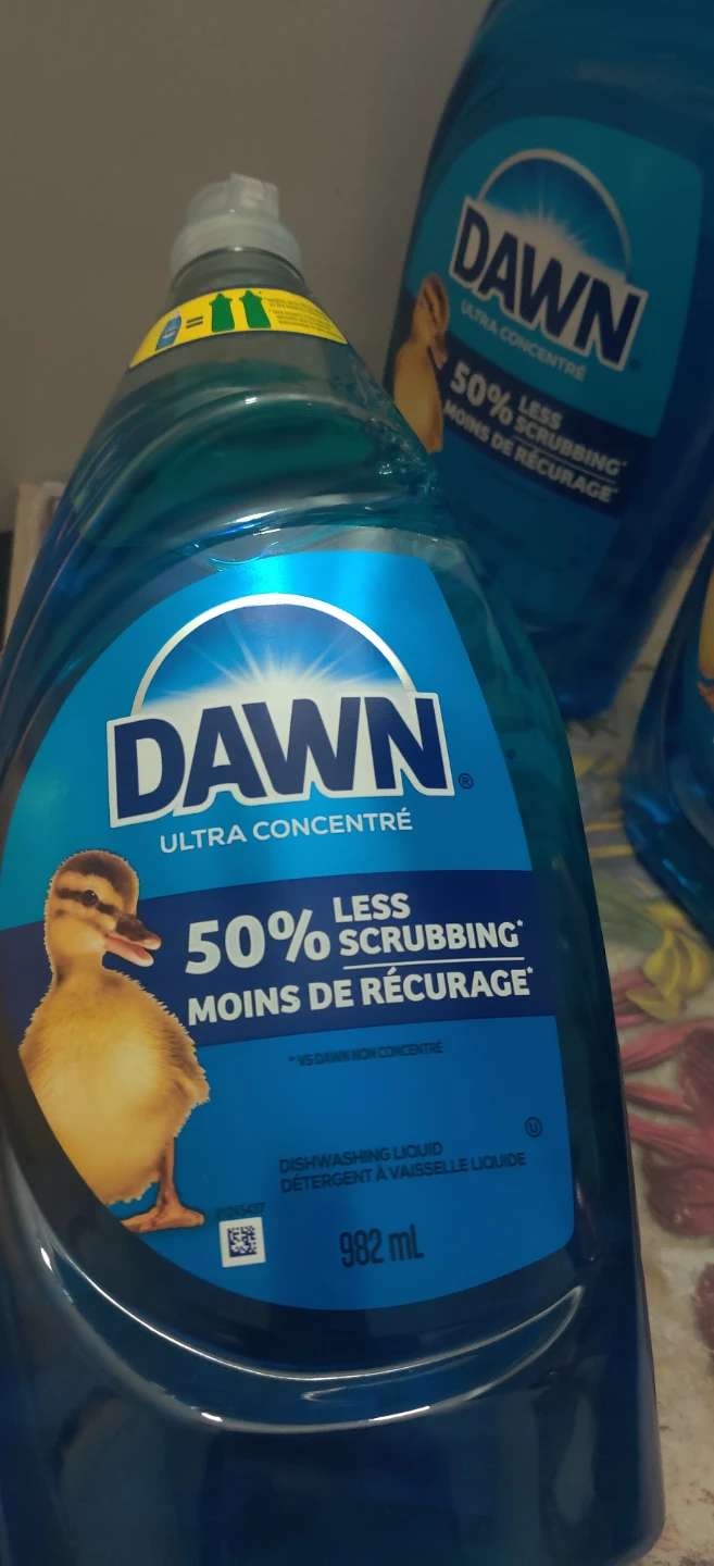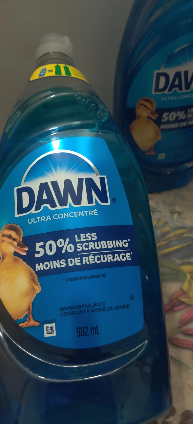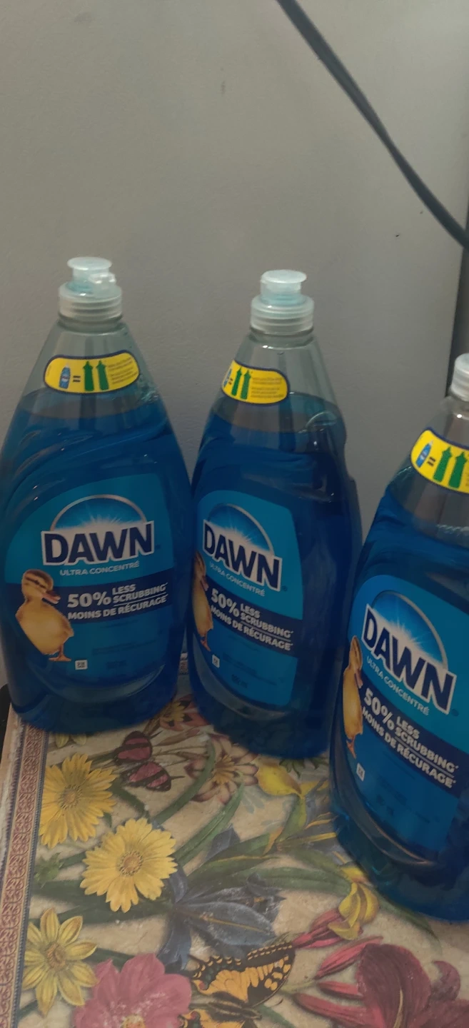 Selling 3 bottles of Dawn Ultra Concentre dishwashing liquid. Each bottle contains 982 mL of detergent, and it promises 50% less scrubbing!
