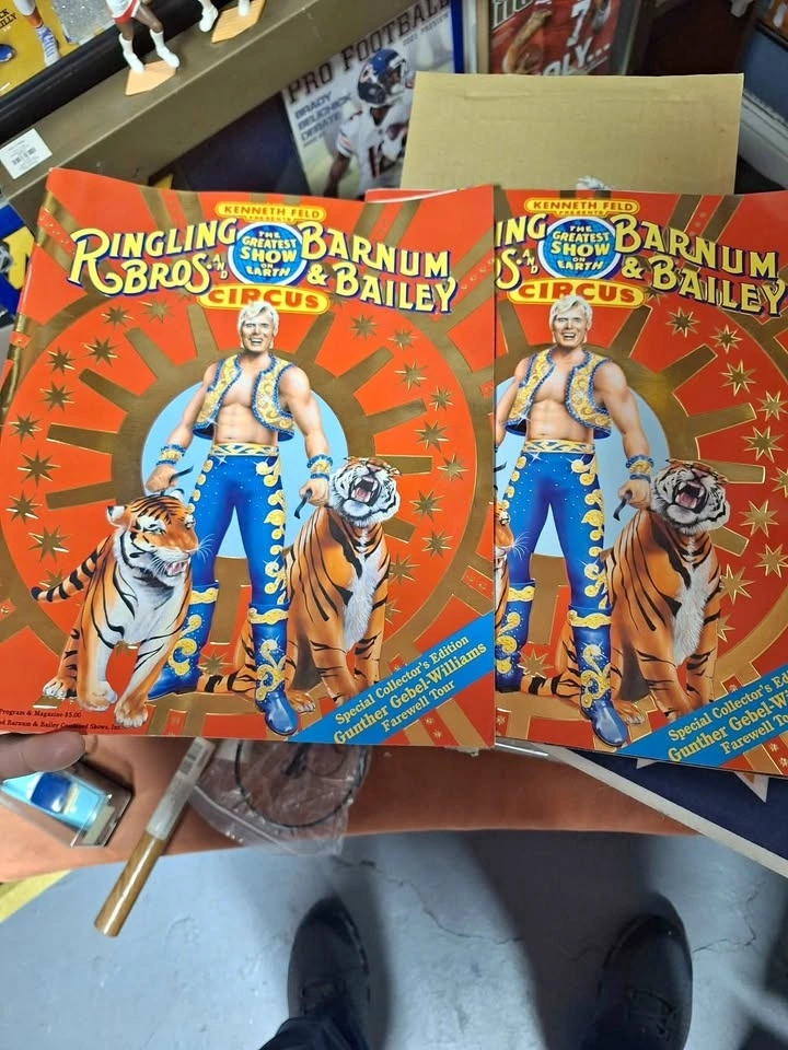 Qty 2 Exquisite, full color program from wild animal trainer Gunther Gebel-Williams' farewell tour in the 119th season of the Ringling Brothers circus. Vintage 1989 souvenir program's 70+ pages is mostly about Gebel-Williams and contains a pull-out poster! The oversized program is 13" tall x 10.75" wide. In beautiful preowned condition with slight corner folding. Price is for both items