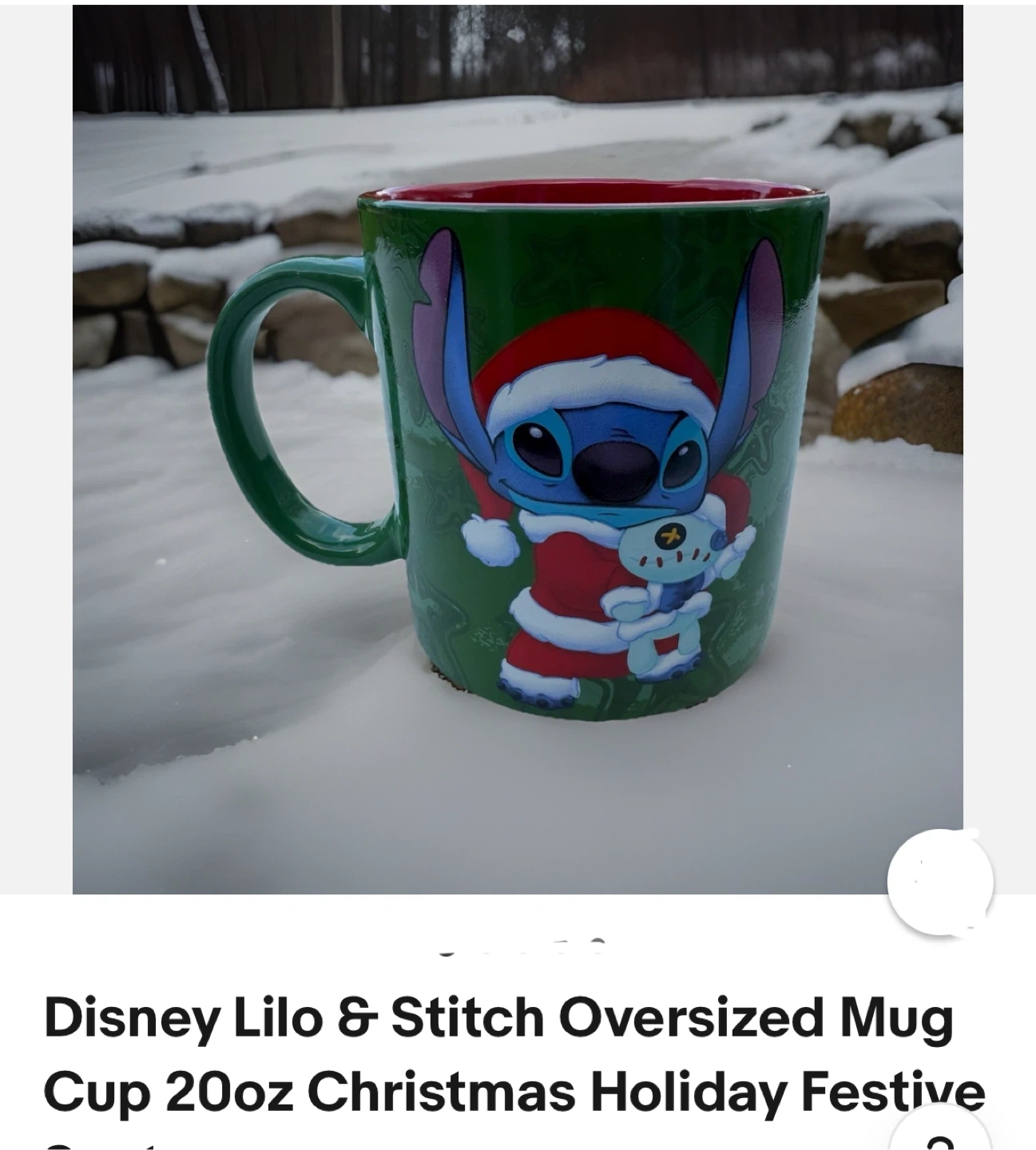 Here's a festive Disney Lilo & Stitch oversized mug, perfect for the Christmas holidays! It holds 20oz and is made of ceramic. It's safe for microwave and dishwasher top rack, making it super convenient for everyday use