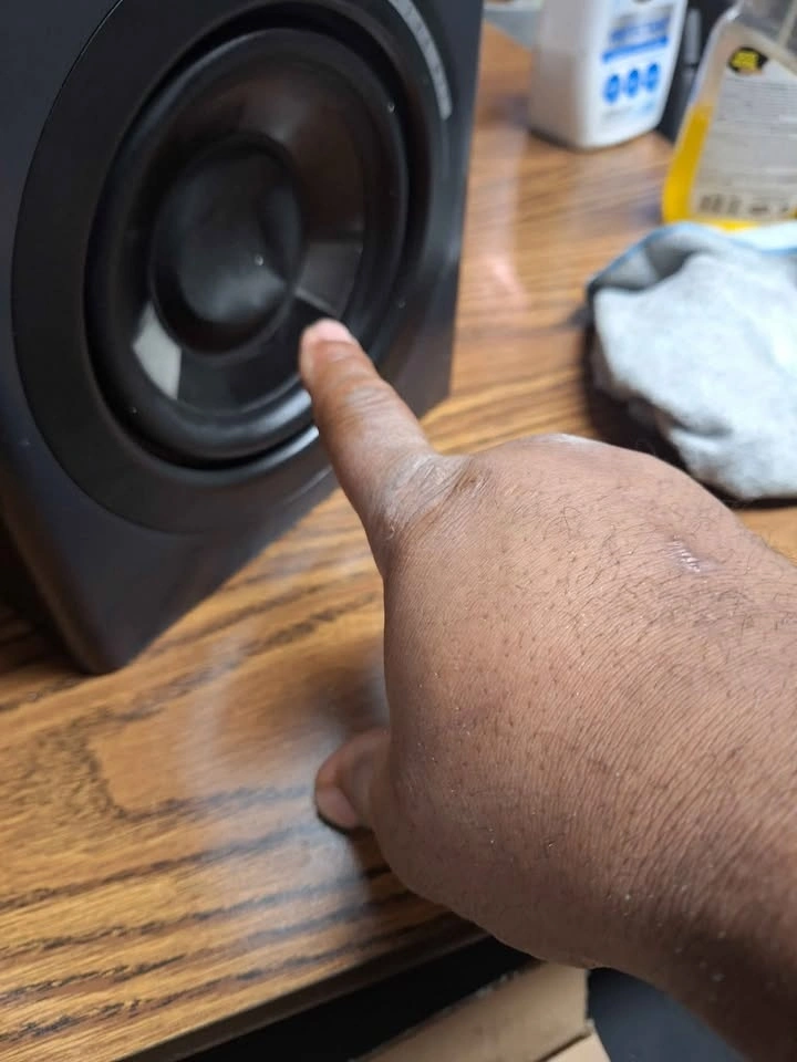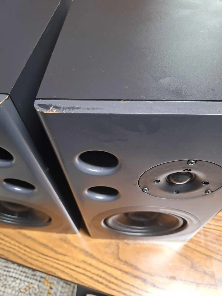 No electronic driver protection, bass dome is push in on 1 speaker bit does not effect bass low minor cosmetic scratches on cabinets