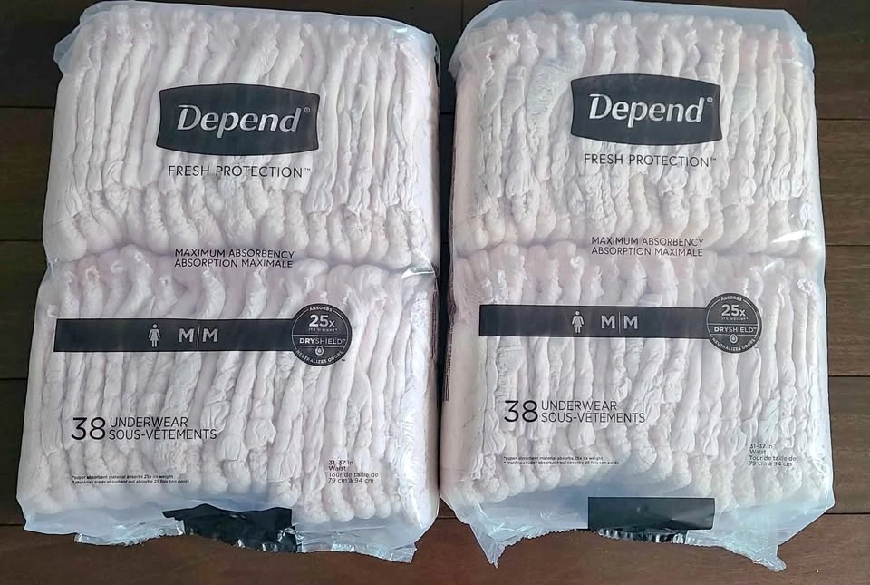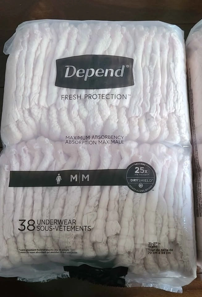 Selling 3 packs of Depend Fresh Protection underwear, size M/M. Each pack contains 38 underwear. They offer maximum absorbency and feature DryShield technology for odour control. The waist size is 31-37 inches (79-94 cm). Depend Fresh Protection Adult Incontinence Underwear for Women (Formerly Depend Fit-Flex), Disposable, Maximum, Medium, Blush (3 Packs of 38)