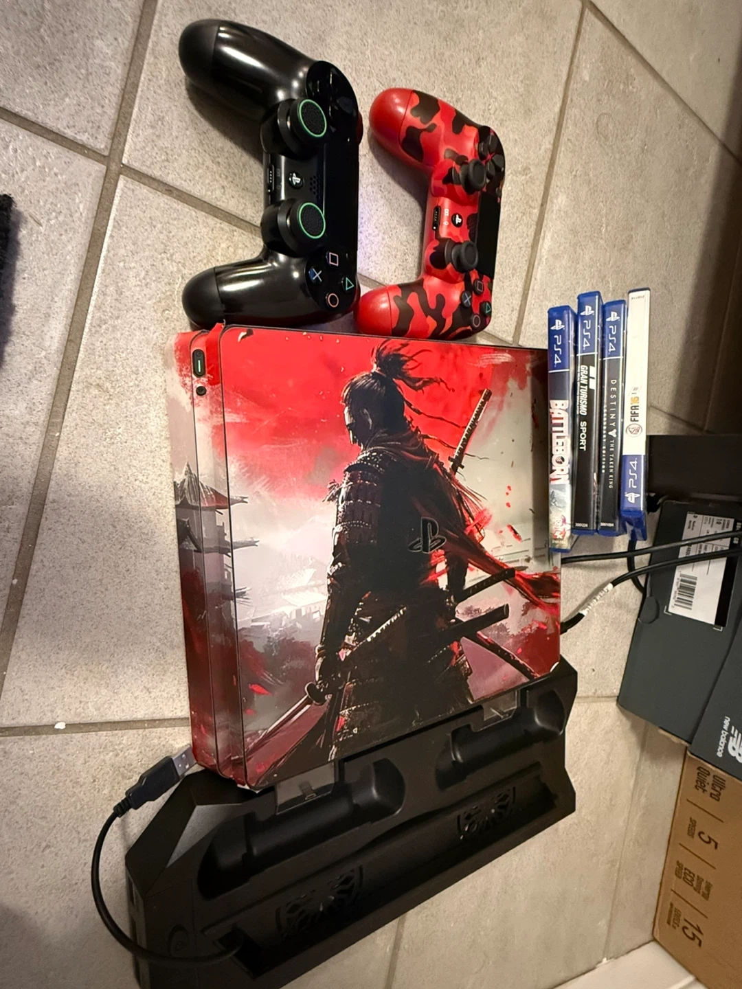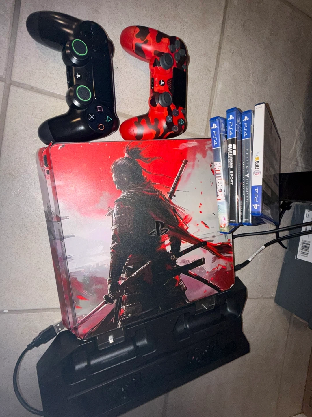 Selling a custom PlayStation 4 console with a unique design! It comes with two controllers and a selection of games. Perfect for anyone looking to upgrade their gaming setup or start a new hobby